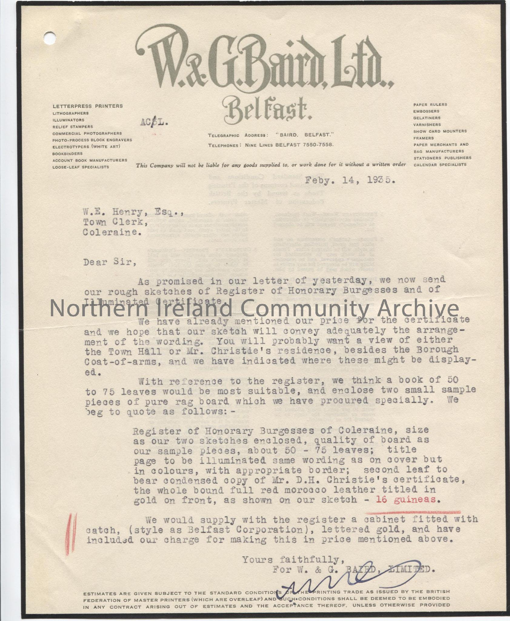 Letter to W. E. Henry, Town Clerk, Coleraine Borough Council from W. & G. Baird. Re: Sketches of Register of Honorary Burgesses and illuminated certificate. Includes the price for the register.