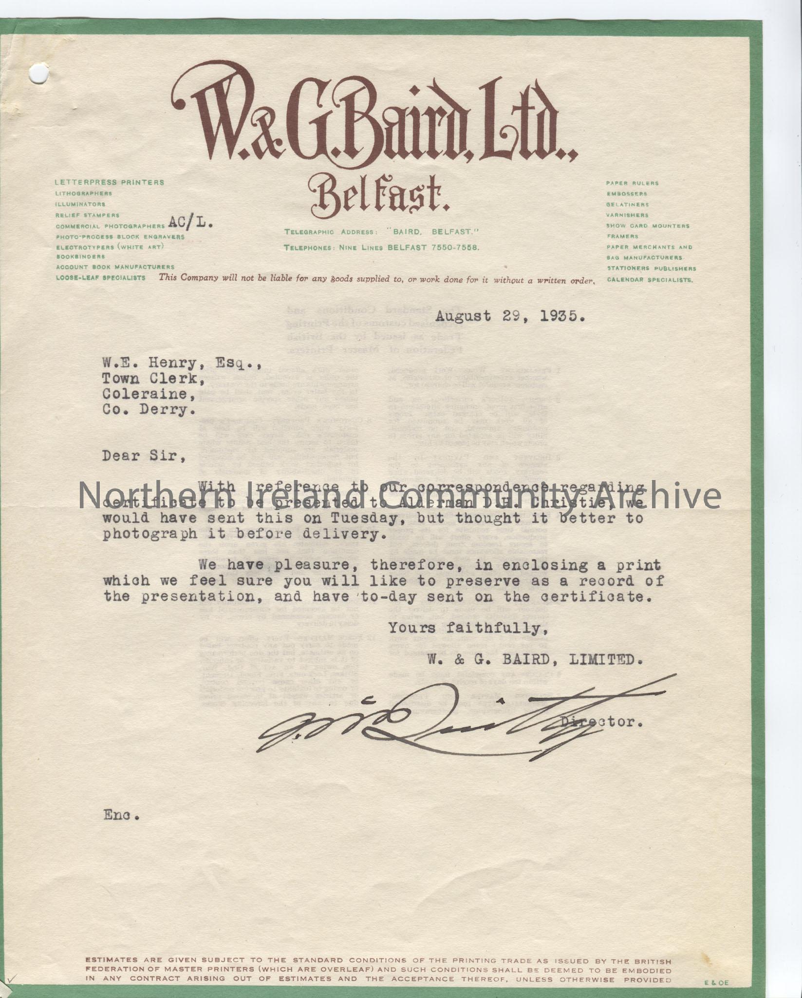 Letter to W. E. Henry, Town Clerk from the Director of W. & G. Baird, informing Mr Henry that they thought it best to photograph the certificate for Alderman D. H. Christie before sending it. A print of the photograph was sent with the letter.