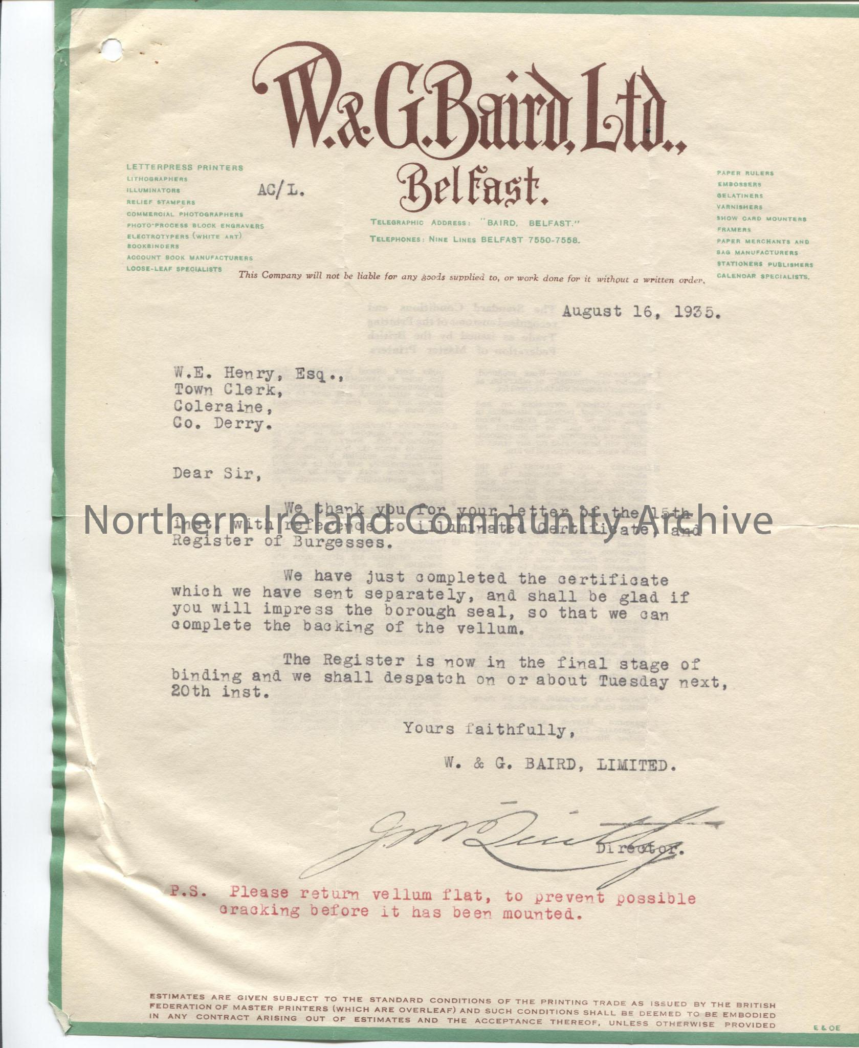 Letter to W. E. Henry, Town Clerk from W. & G. Baird, re: illuminated certificate and Register of Burgesses.