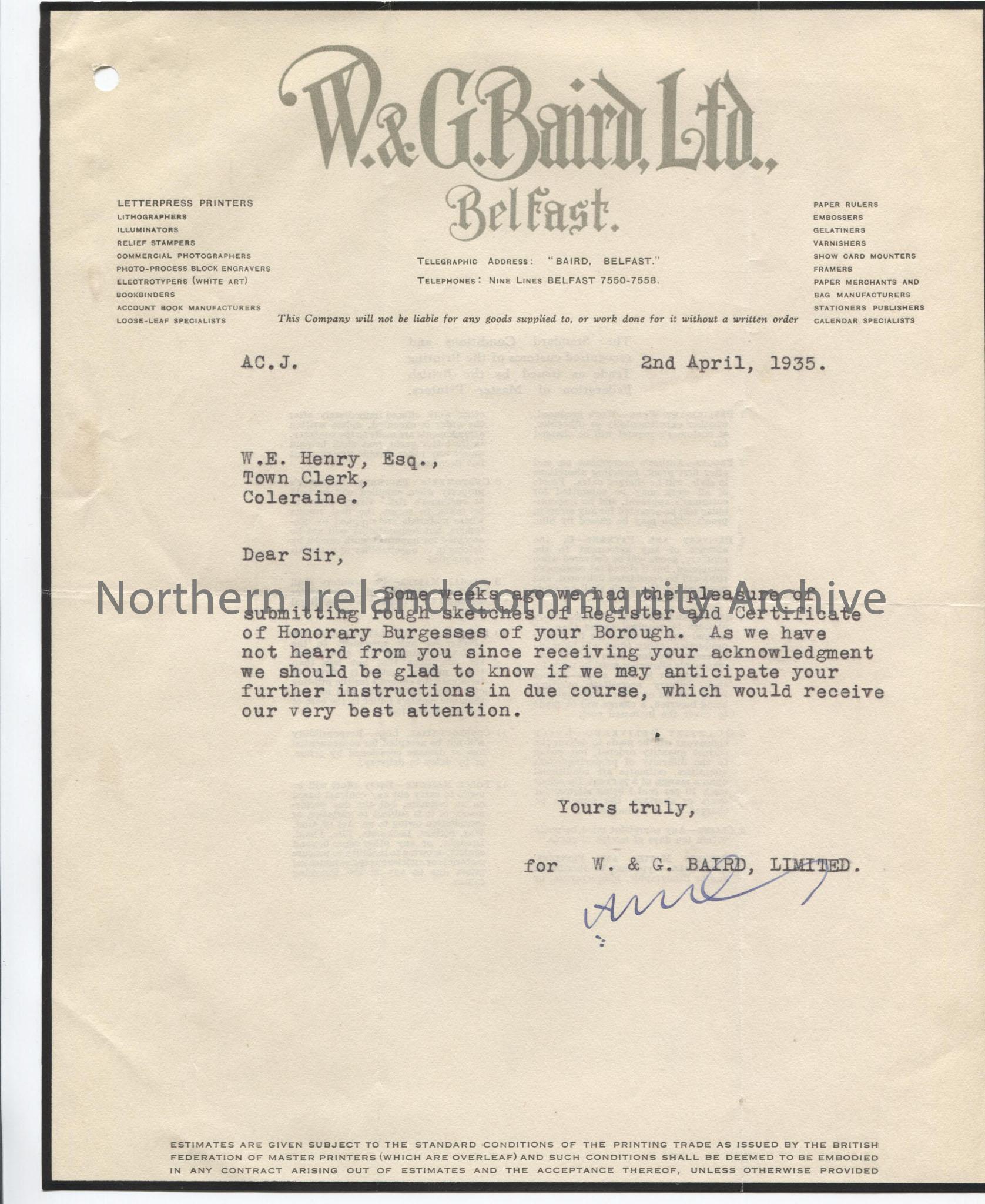 Letter to W. E. Henry, Town Clerk from W. & G. Baird, re: the rough sketches of the Register and Certificate that the Company had submitted - enquiring as to whether they will be commissioned to carry out the work.