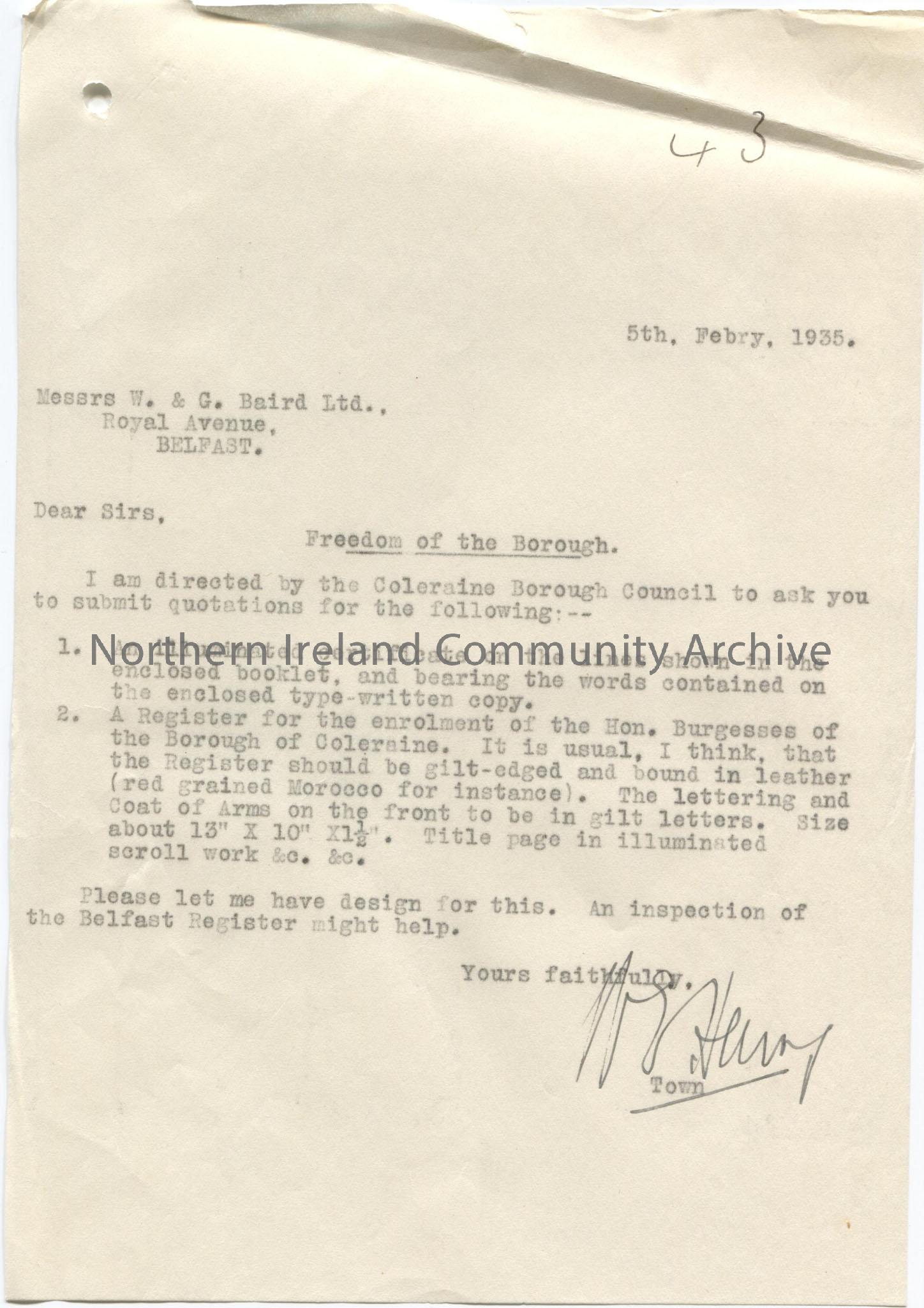 Letter to W. & G. Baird Ltd from the Town Clerk of Coleraine Borough Council W. E. Henry. Re: Freedom of the Borough. Asking for a quotation for an illuminated certificate and a Register for the enrolment of the Hon. Burgesses of the Borough of Coleraine.