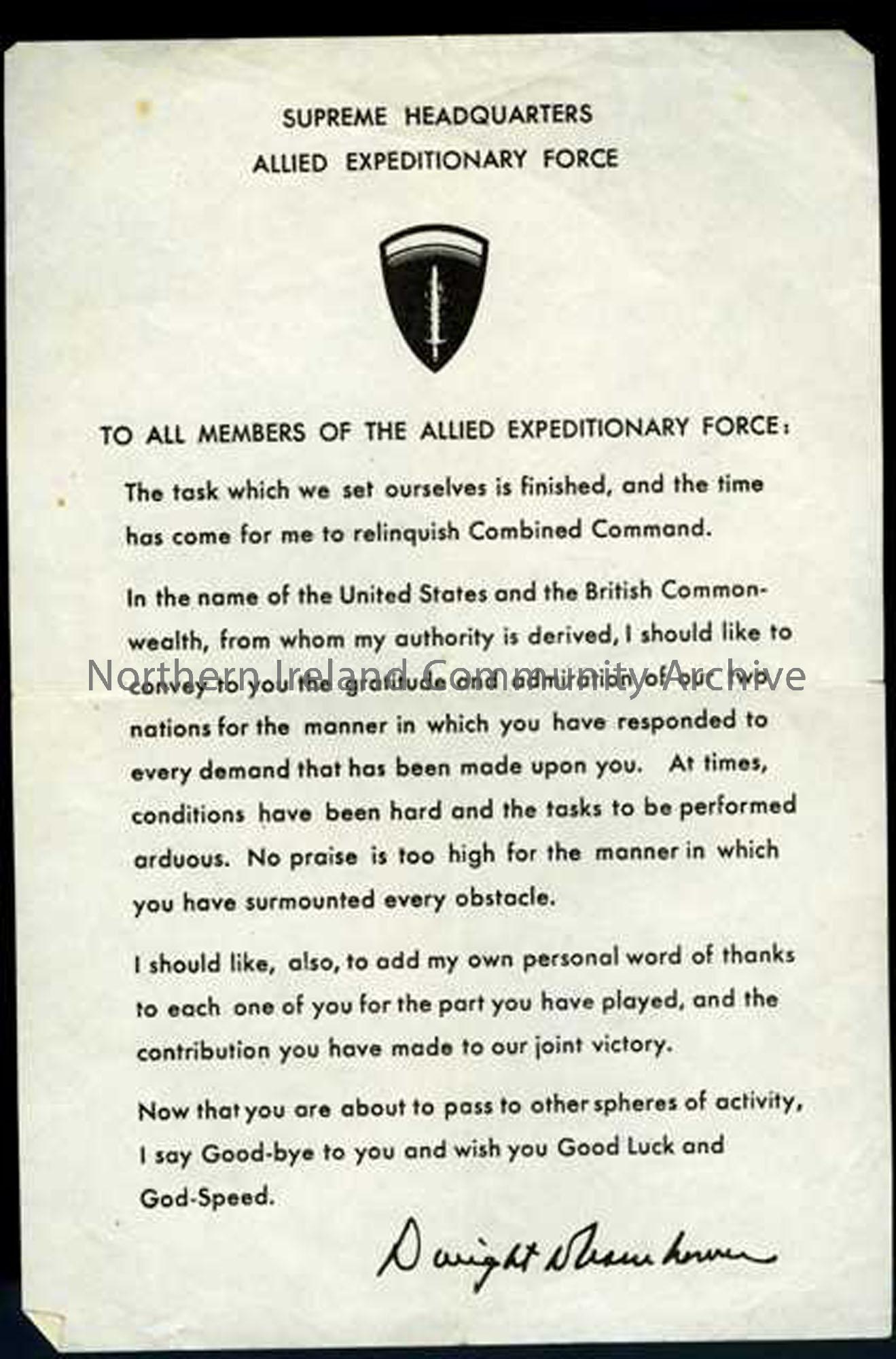 Supreme Headquarters Allied Expeditionary Force letter to troops.