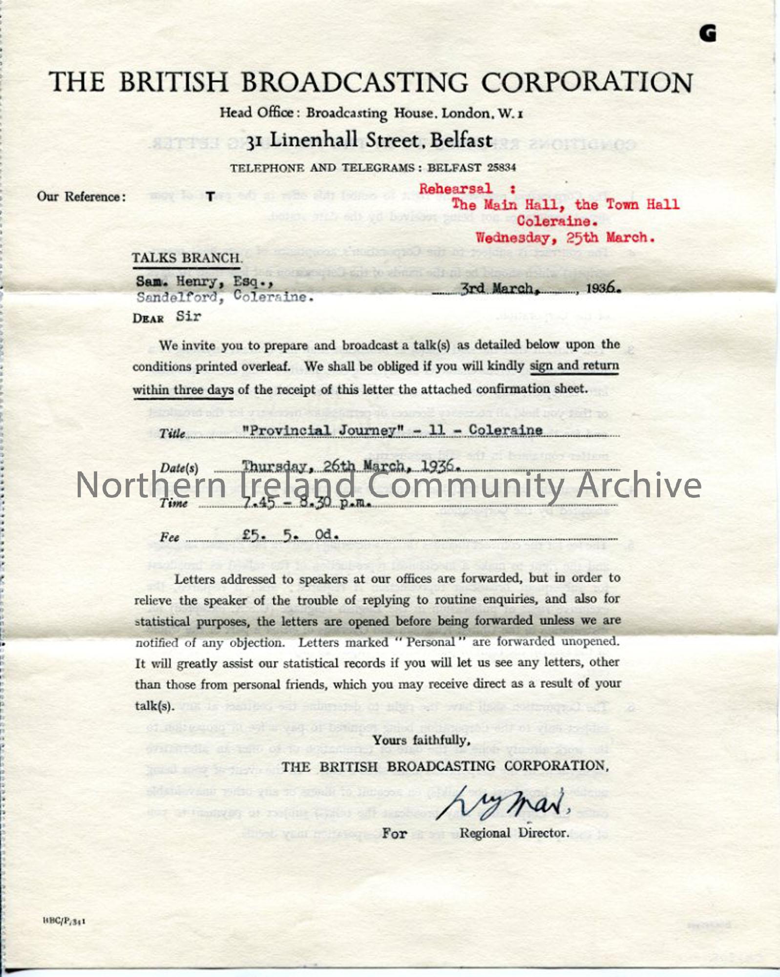 Typed letter/contract on BBC headed notepaper from the Regional Director relating to the 'Provincial Journey' programme - formal agreement for the title, date, time and fee. Dated 3.3.1936.