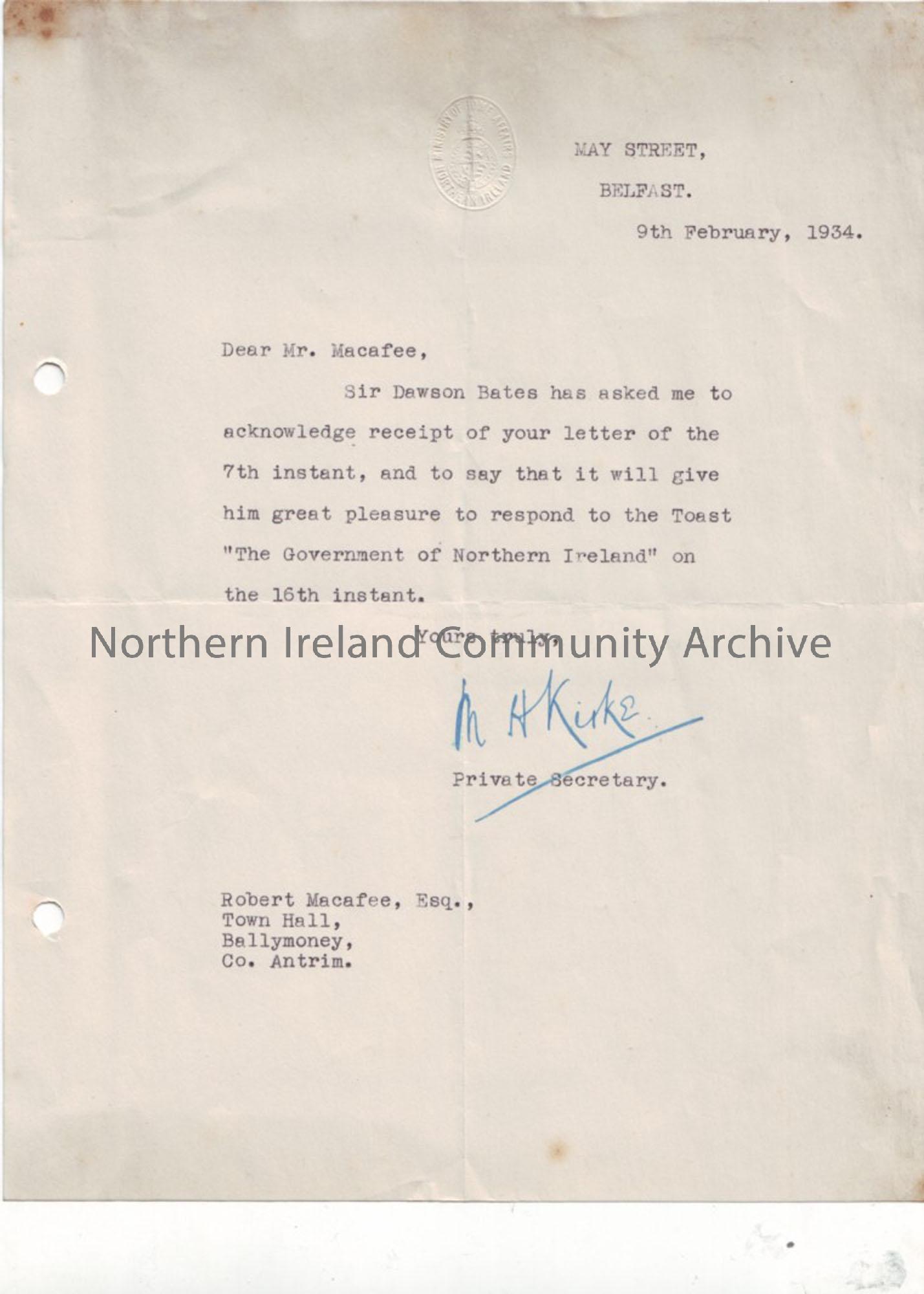 Letters accepting and responding to the invitation to toast at the re-opening of the Town Hall on Friday 16th February 1934