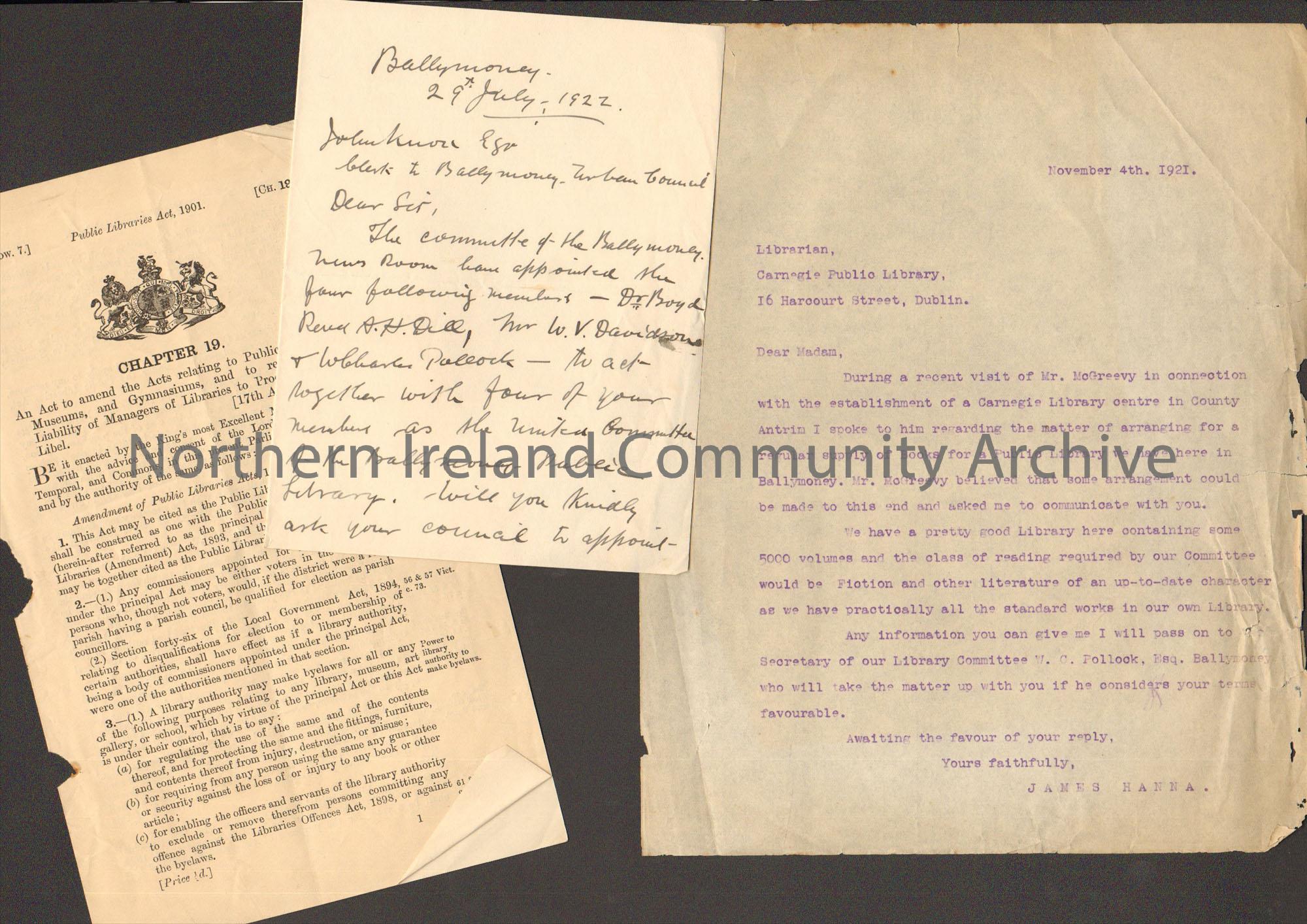 Letters, documents and official acts of Parliament relating to Ballymoney Library and libraries in general.