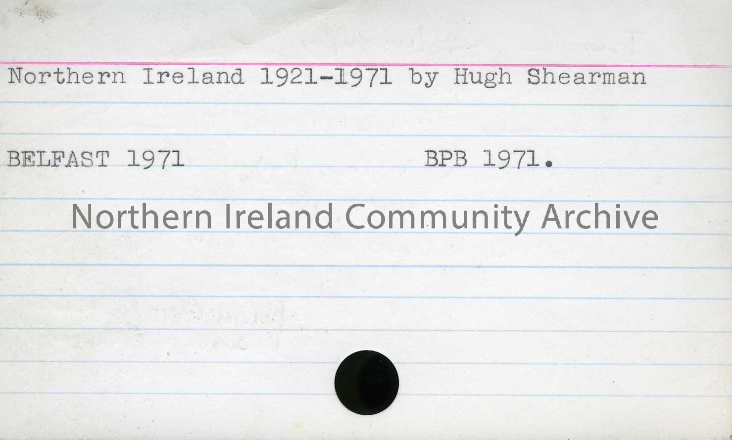 library card titled, Northern Ireland 1921-1971 by Hugh Shearman. Belfast 1971. BPB 1971.