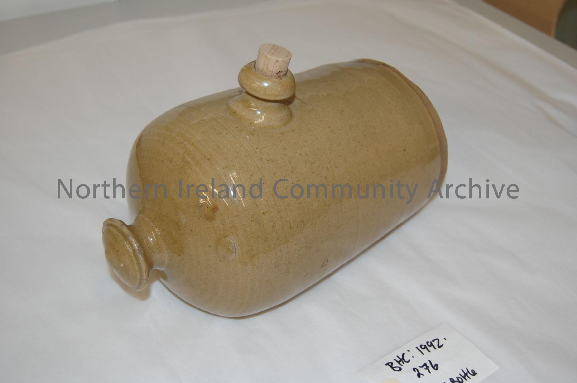 Light brown coloured cylindrical shaped stoneware hot water bottle.The body of the bottle is flattened on one side and there is a mouth with a cork stopper on the opposite side of the body.