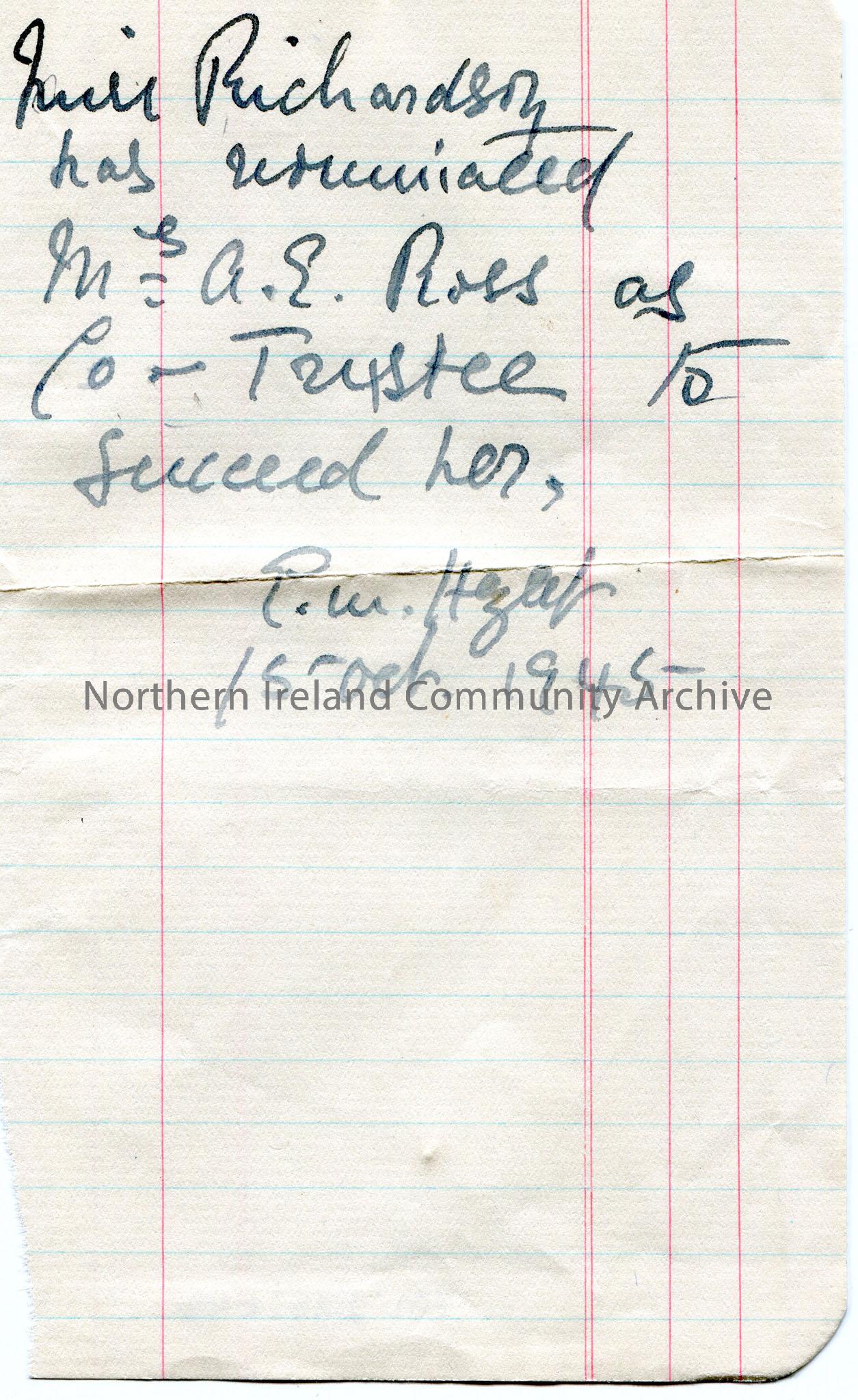 Lined page of handwritten note stating Miss Richardson has appointed Ms? A.E.Ross as Co-Trustee to succeed her, E.M.Hezlet, 15th October, 1945.