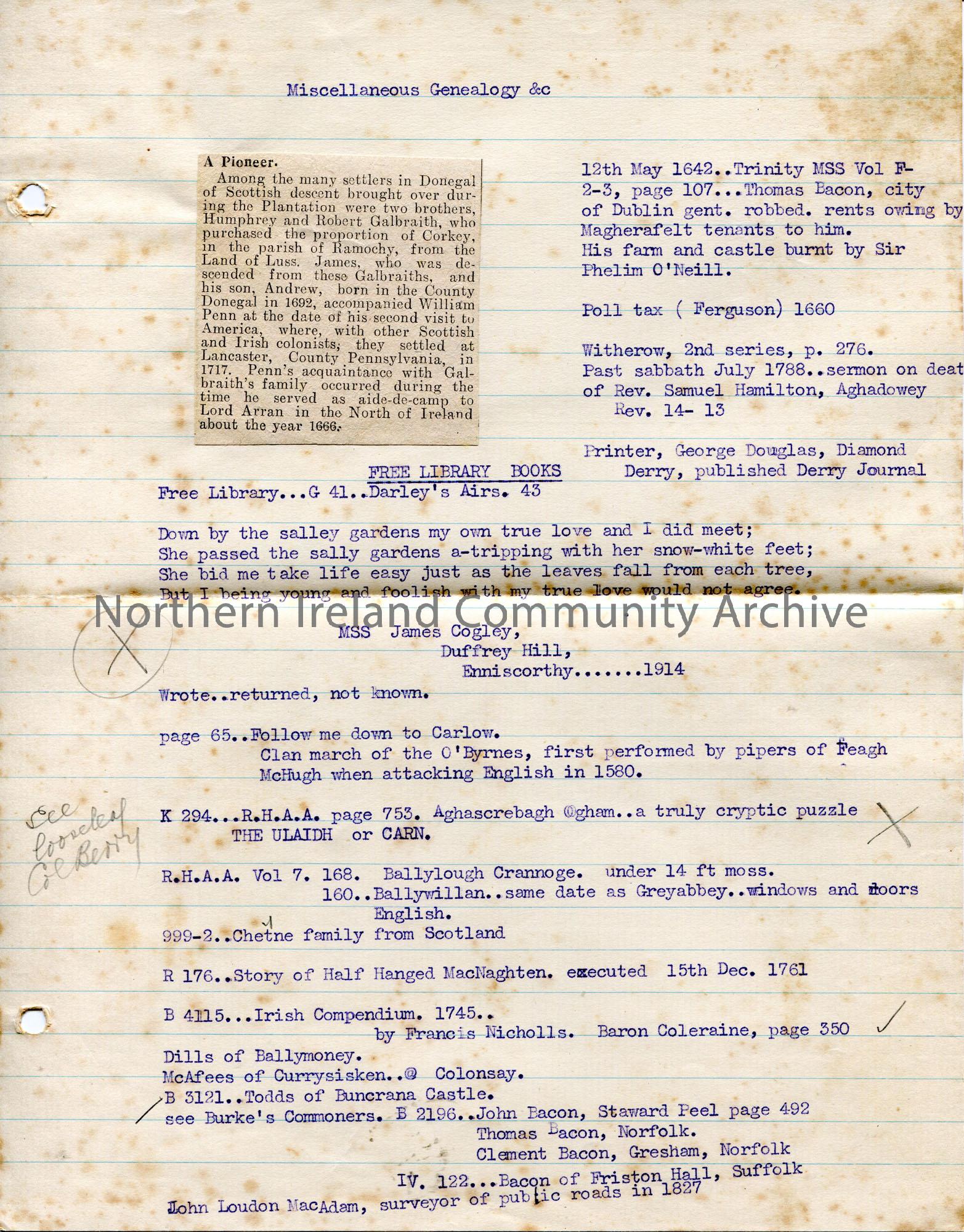 Lined page of typed notes titled, 'Miscellaneous Genealogy &c'. Small newspaper cutting pasted to page titled, 'A Pioneer' re settlement in Pennsylvania in 1717 of Andrew Galbraith and William Penn. Document also features one verse of the song 'Down by the Sally Gardens'.