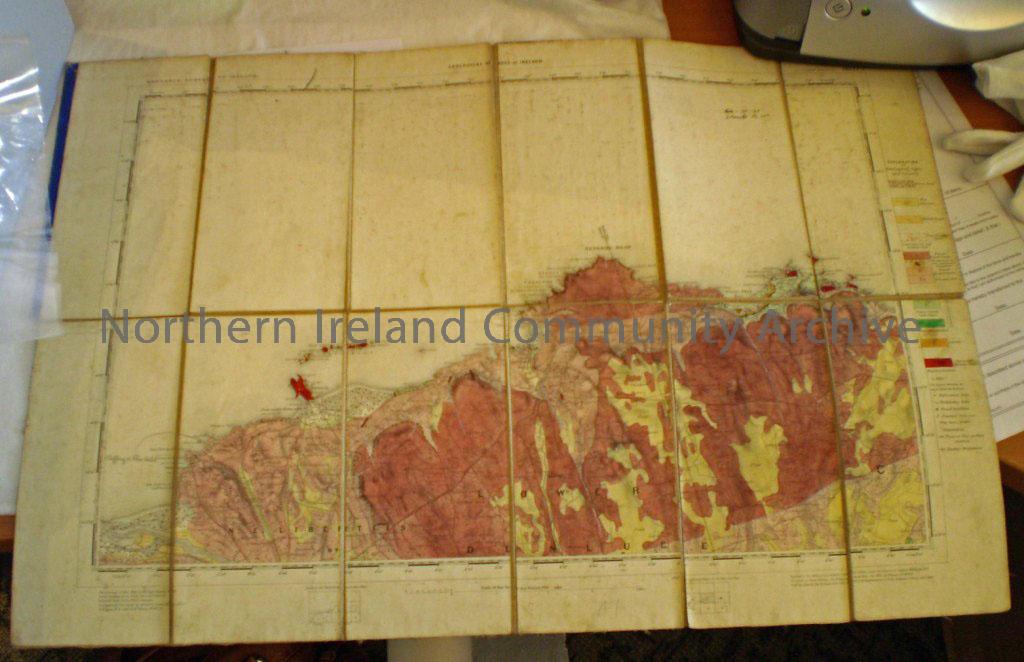 Linen map of ‘Giant’s Causeway’. Features Porstewart, Portrush, round to Giant’s Causeway, Bengore Head and to Carrick-a-Rede. Features geology of the…