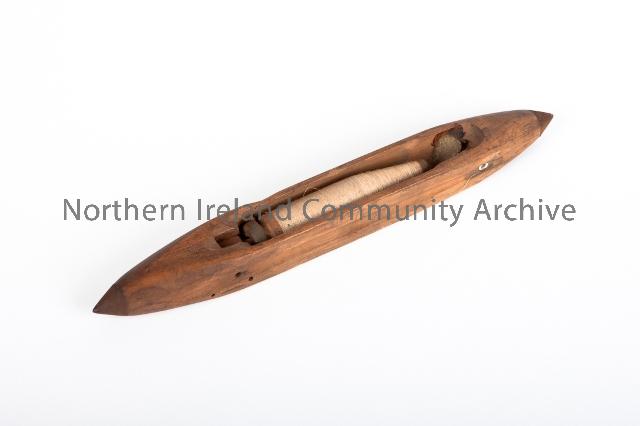 Wooden linen shuttle with cream thread. Courtesy of Coleraine Museum.