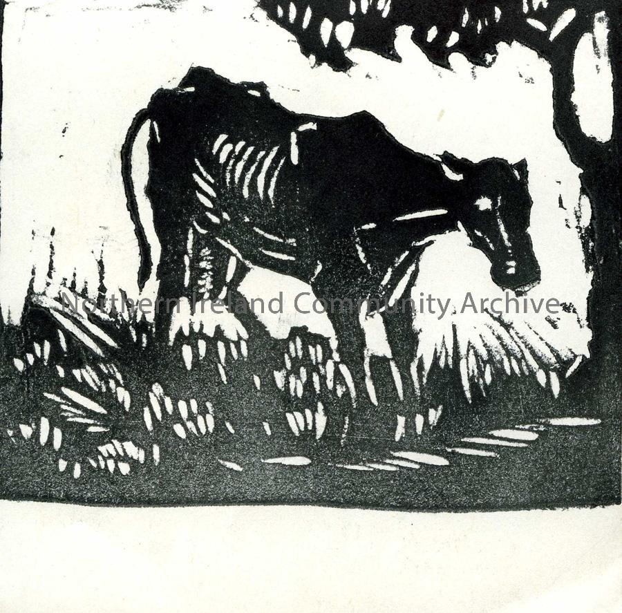 Linocut illustration by a child at Tullygrawley P.E.S. Image of an a cow beside a tree.