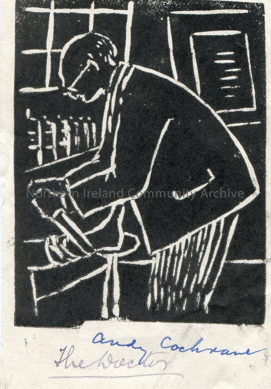 Linocut illustration by a child at Tullygrawley P.E.S. Image of a man strapping a person's foot in a bandage. Titled, 'The Doctor' by Andy Cochrane.