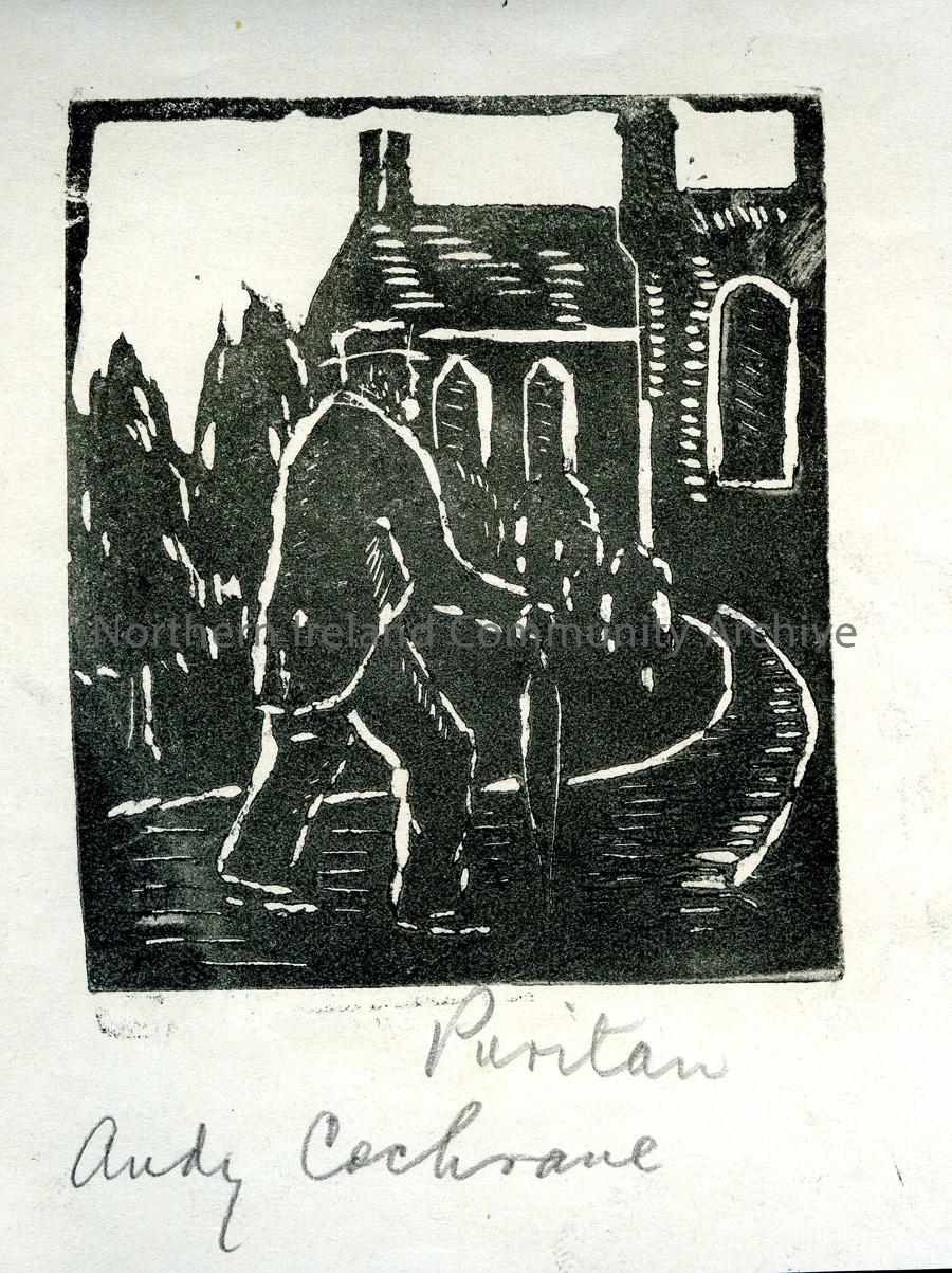 Linocut illustration by a child at Tullygrawley P.E.S. Image of a man walking with what looks like an umbrella along a pathway. Buildings in the background. Titled, 'Puritan'. By Andy Cochrane.
