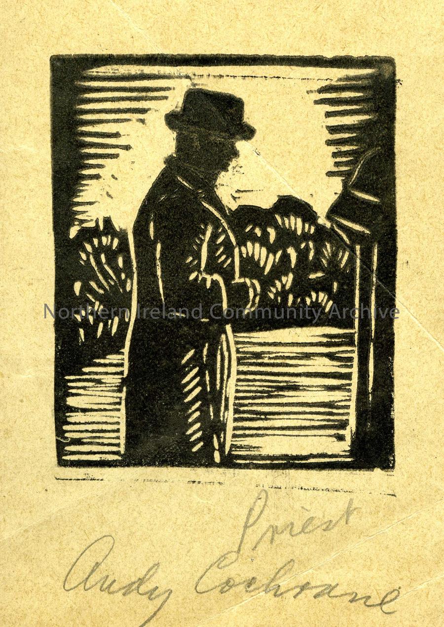 Linocut illustration by a child at Tullygrawley P.E.S. Image on brown paper of a man wearing a coat and hat. 'Priest' and 'Andy Cochrane' handwritten in pencil below image.