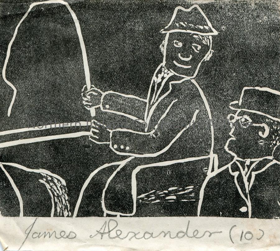 Linocut illustration by a child at Tullygrawley P.E.S. Image of two men. One is on a horse and cart holding a whip. The other is standing beside the cart. By James Alexander aged 10. 'The Professor: 'Do you know where you're going, Pat?'', is handwritten on back of illustration.