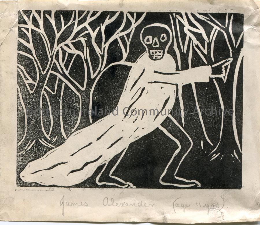 Linocut illustration by a child at Tullygrawley P.E.S. Image of a ghost or banshee type figure with trees in the background. By James Alexander aged 11.