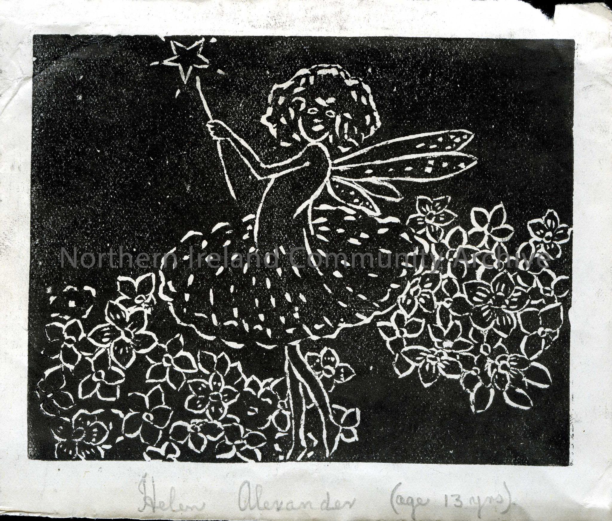 Linocut illustration by children at Tullygrawley P.E.S. Image of a fairy surrounded by flowers holding a wand. By Helen Alexander aged 13.