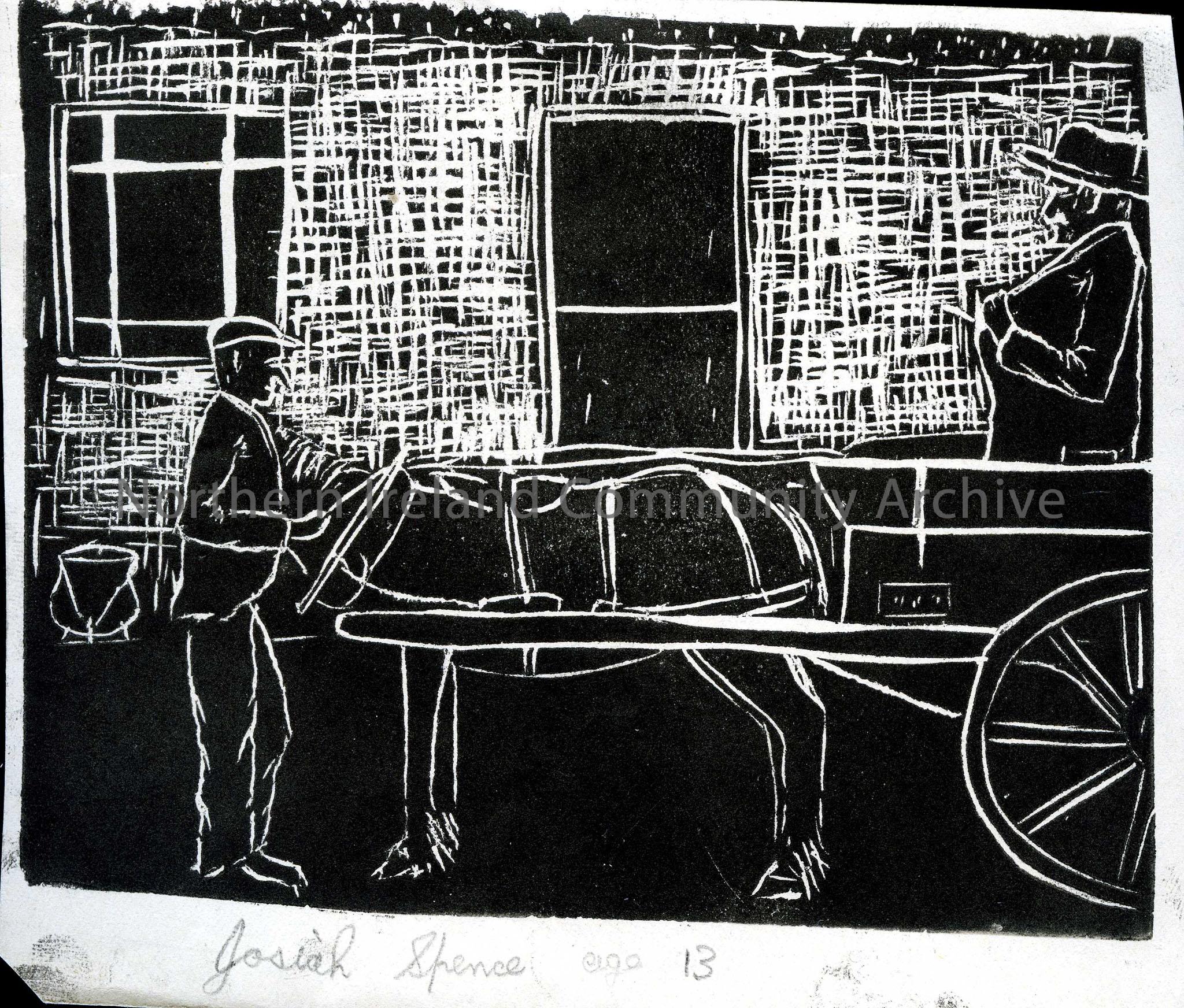 Linocut illustration by children at Tullygrawley P.E.S. Image of a horse and cart. One man is sitting in the cart and the other is standing by the horse. By Josiah Spence aged 13.