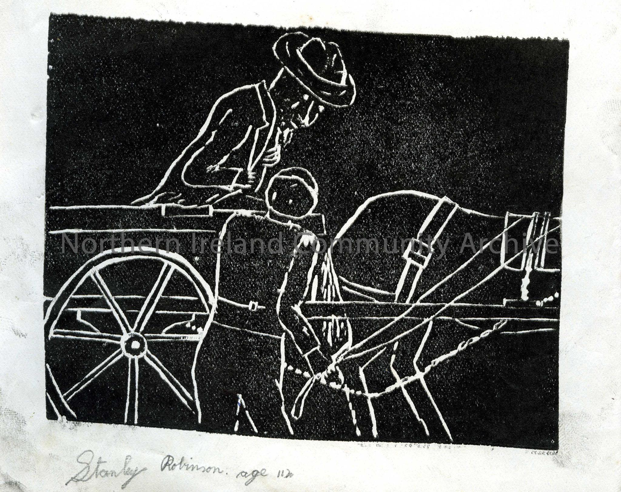 Linocut illustration by children at Tullygrawley P.E.S. Image of a horse and cart. Two men are talking to each other. One is sitting in the cart and the other is holding onto the horse rein. By Stanley Robinson aged 11.