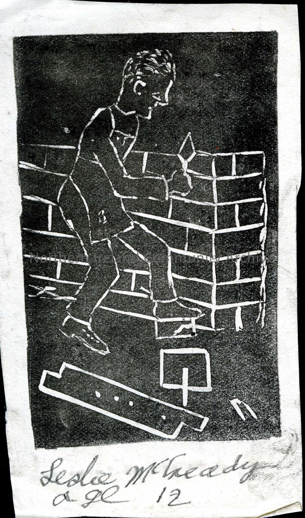 Linocut illustration by children at Tullygrawley P.E.S. Image of a man building a wall. By Leslie McCready aged 12.