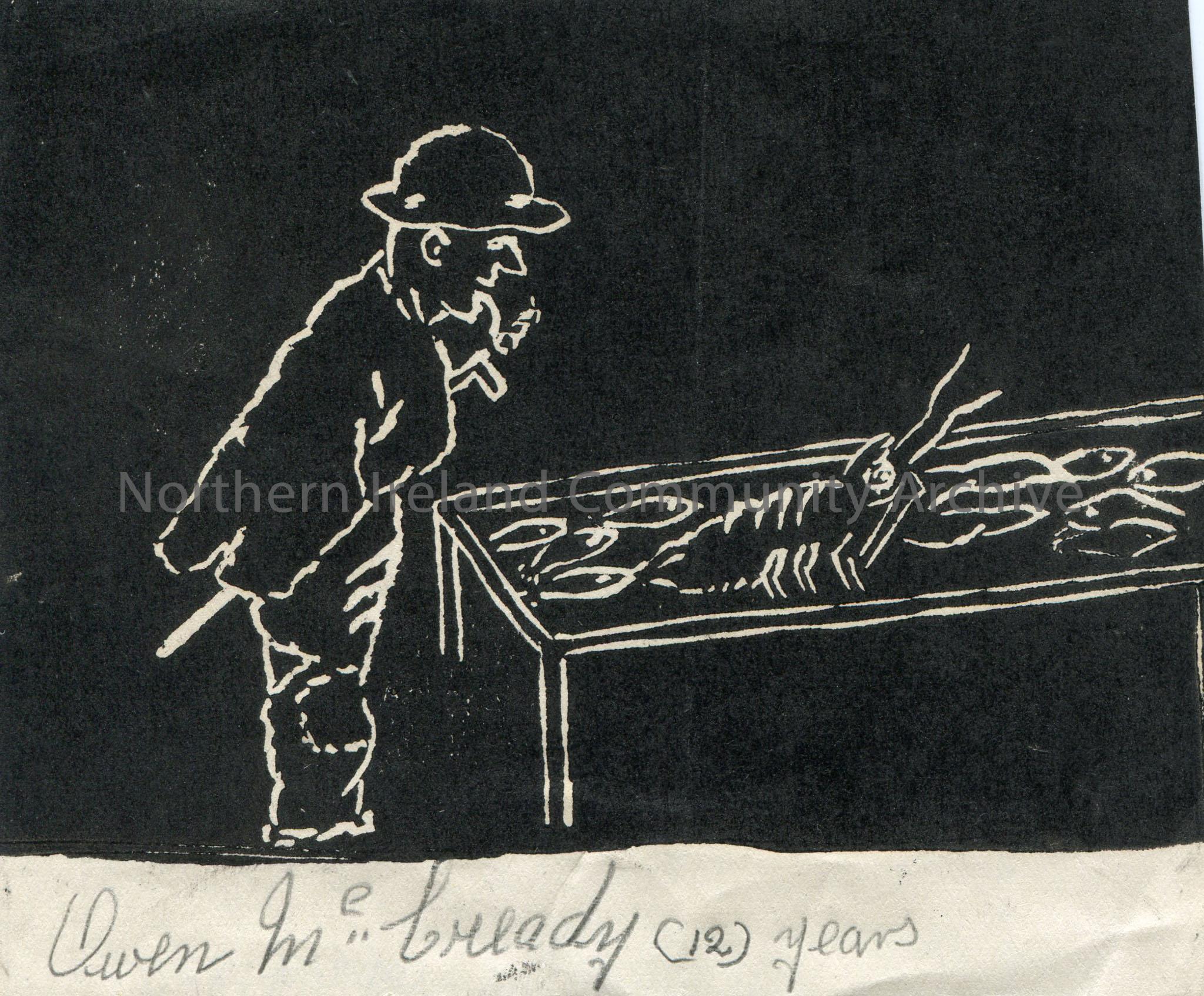 Linocut illustration by children at Tullygrawley P.E.S. Image of a man looking a a lobster and other fish on a table. By Owen McCready aged 12.