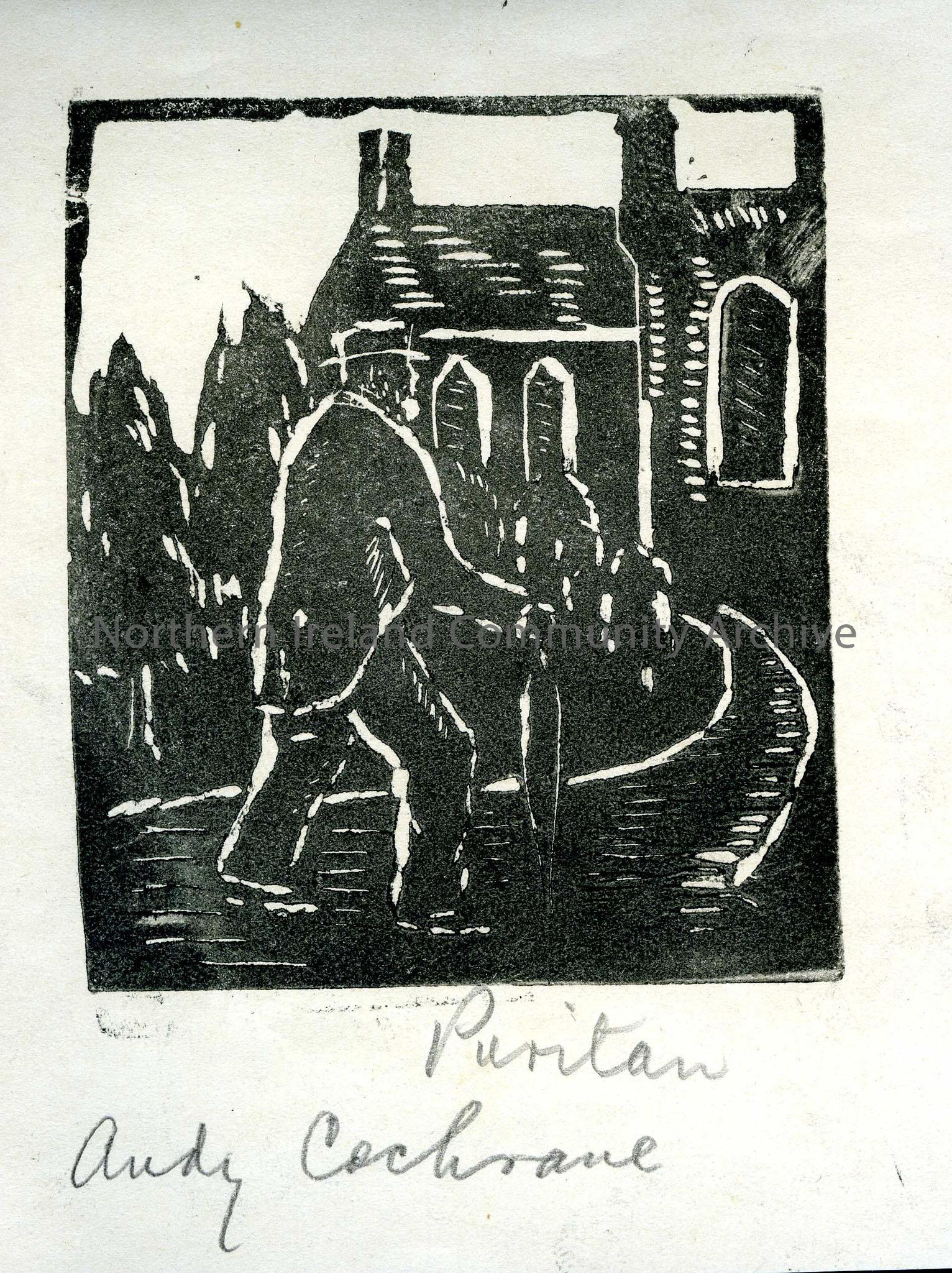 Linocut illustration by children at Tullygrawley P.E.S. Image of a man walking with what looks like an umbrella along a pathway. Buildings in the background. Titled, 'Puritan'. By Andy Cochrane.