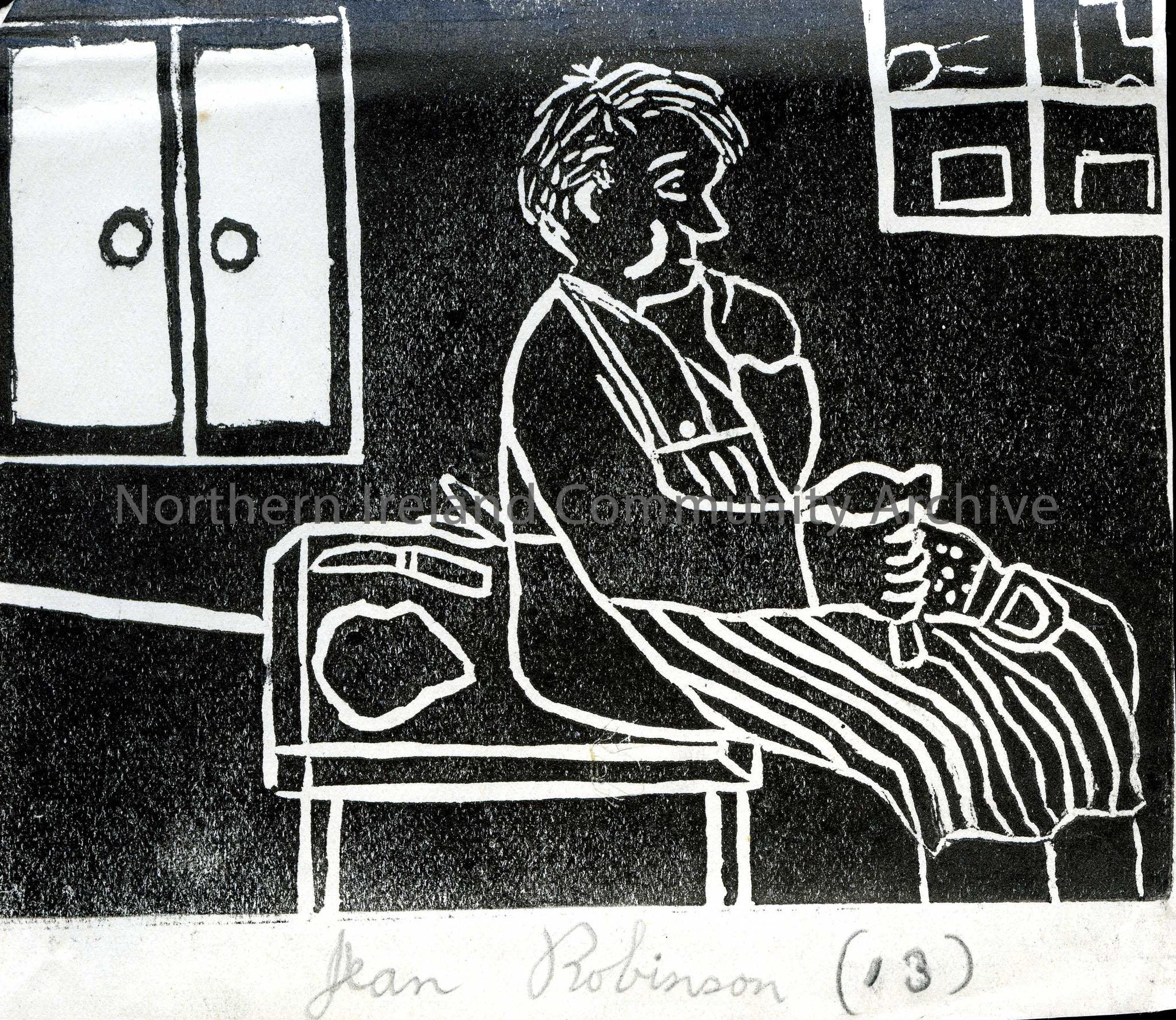Linocut illustration by children at Tullygrawley P.E.S. Image of a shoe cobbler mending a shoe. By Jean Robinson aged 13.