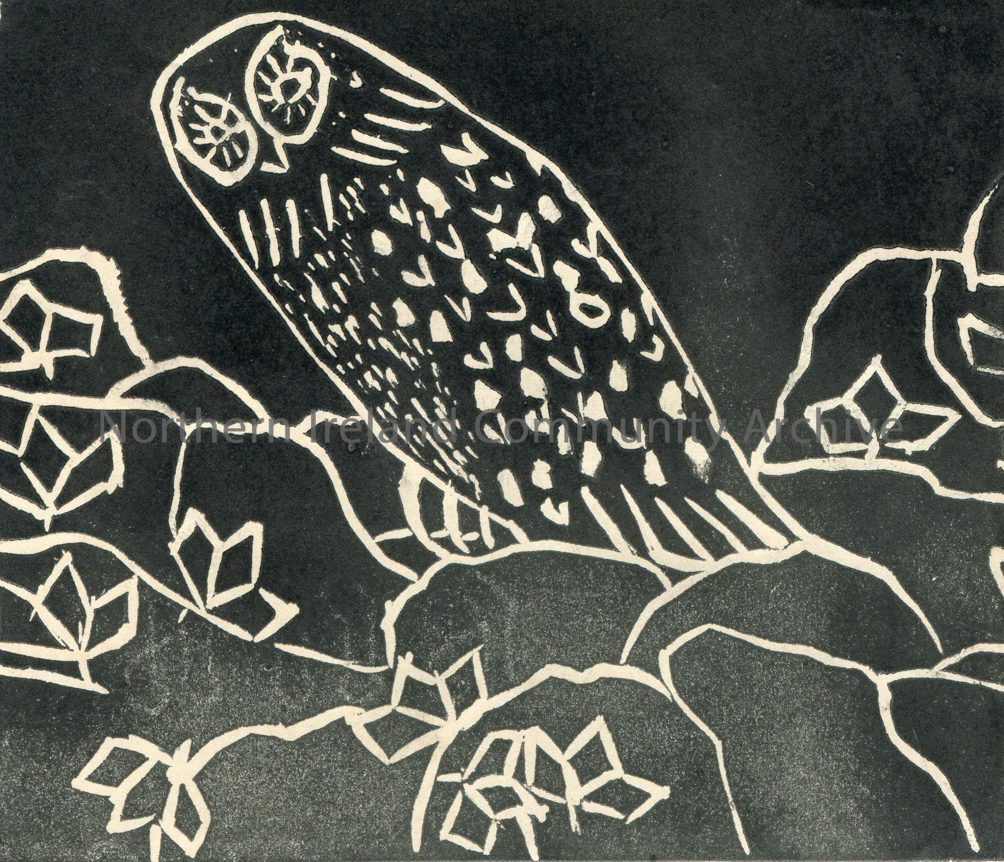Linocut illustration by children at Tullygrawley P.E.S. Image of an owl.