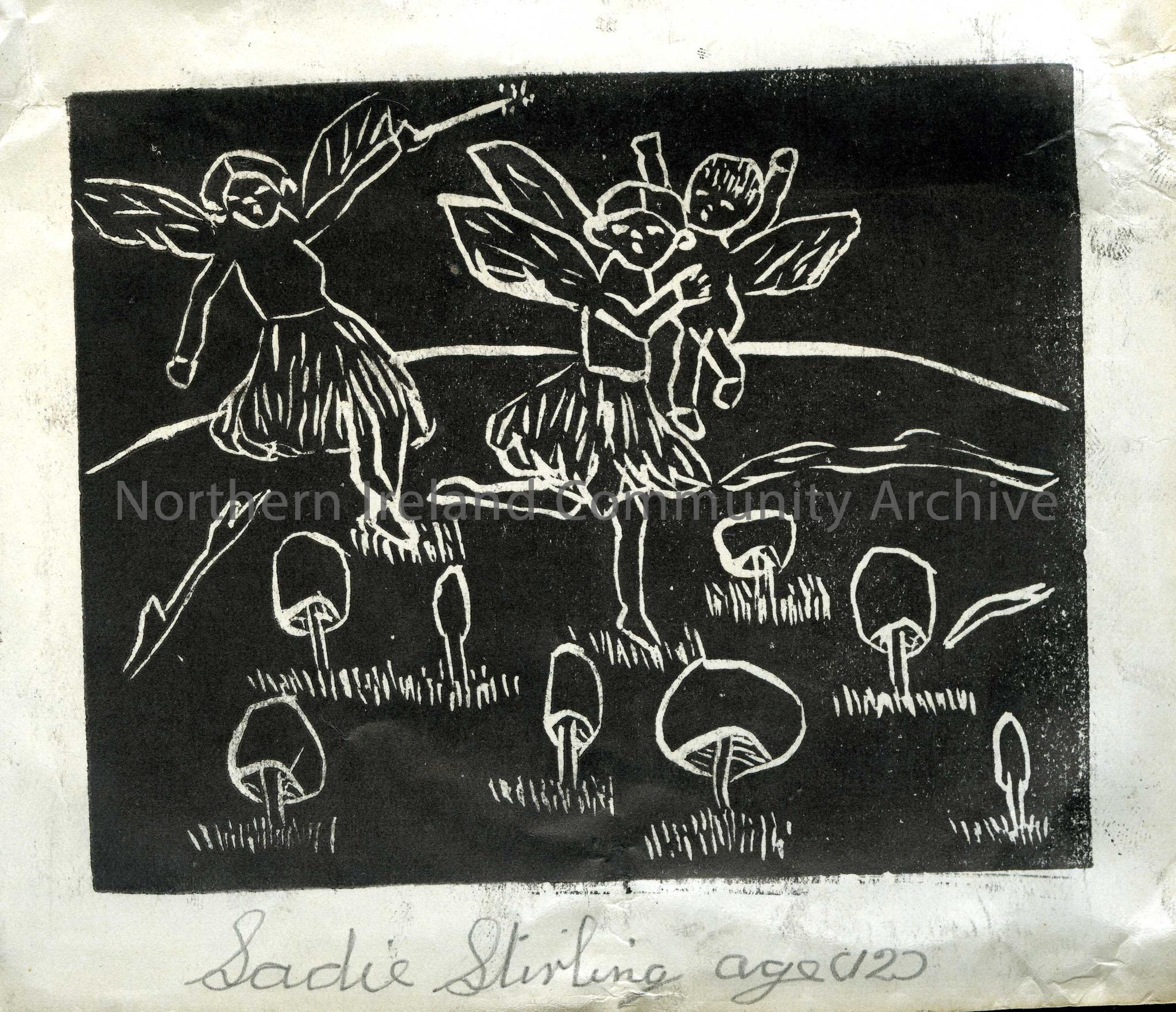 Linocut illustration by children at Tullygrawley P.E.S. Image of three fairies. By Sadie Stirling aged 12.