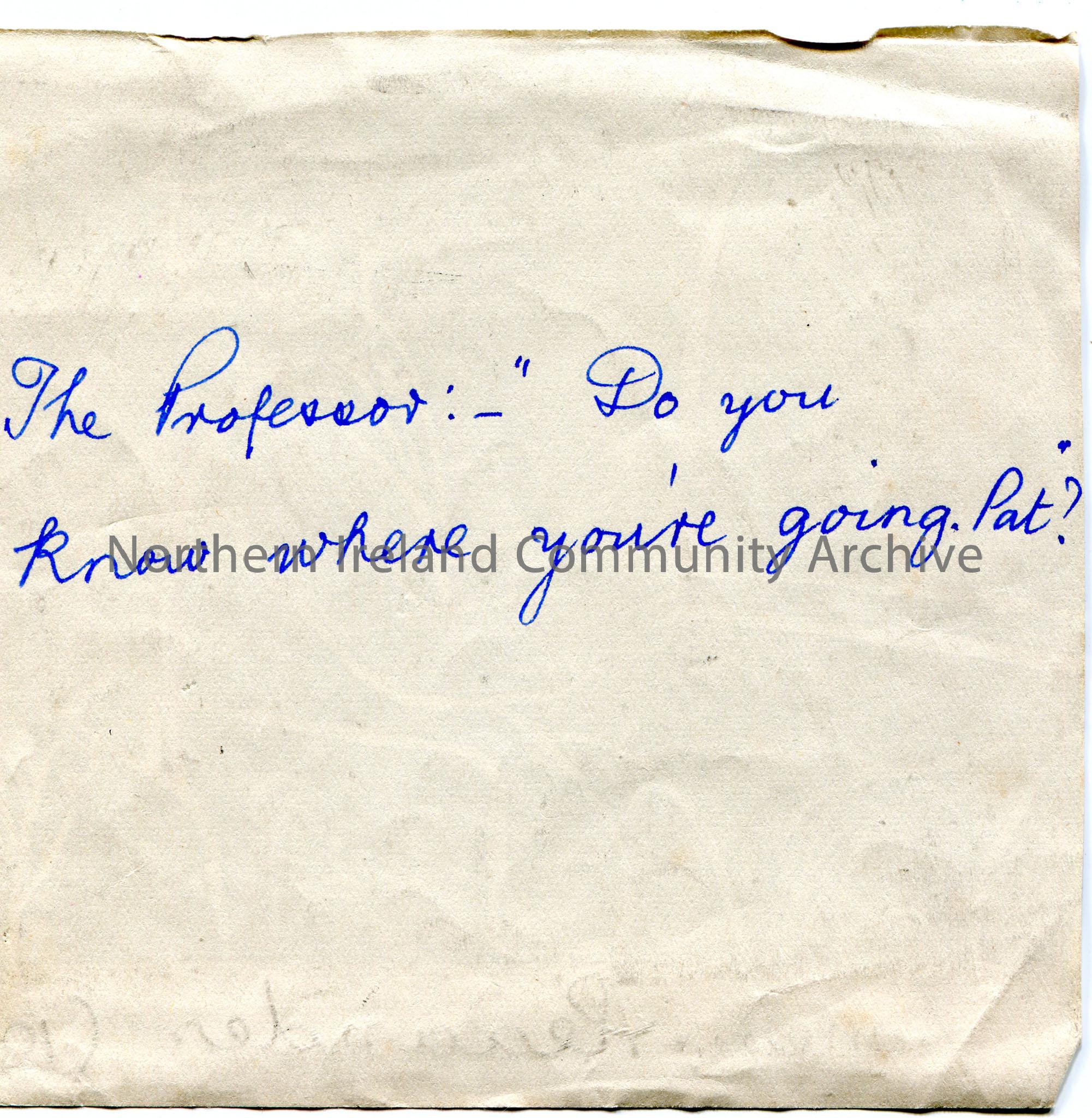 Linocut illustration by children at Tullygrawley P.E.S. Image of two men. One is on a horse and cart holding a whip. The other is standing beside the cart. By James Alexander aged 10. 'The Professor: 'Do you know where you're going, Pat?'', is handwritten on back of illustration.