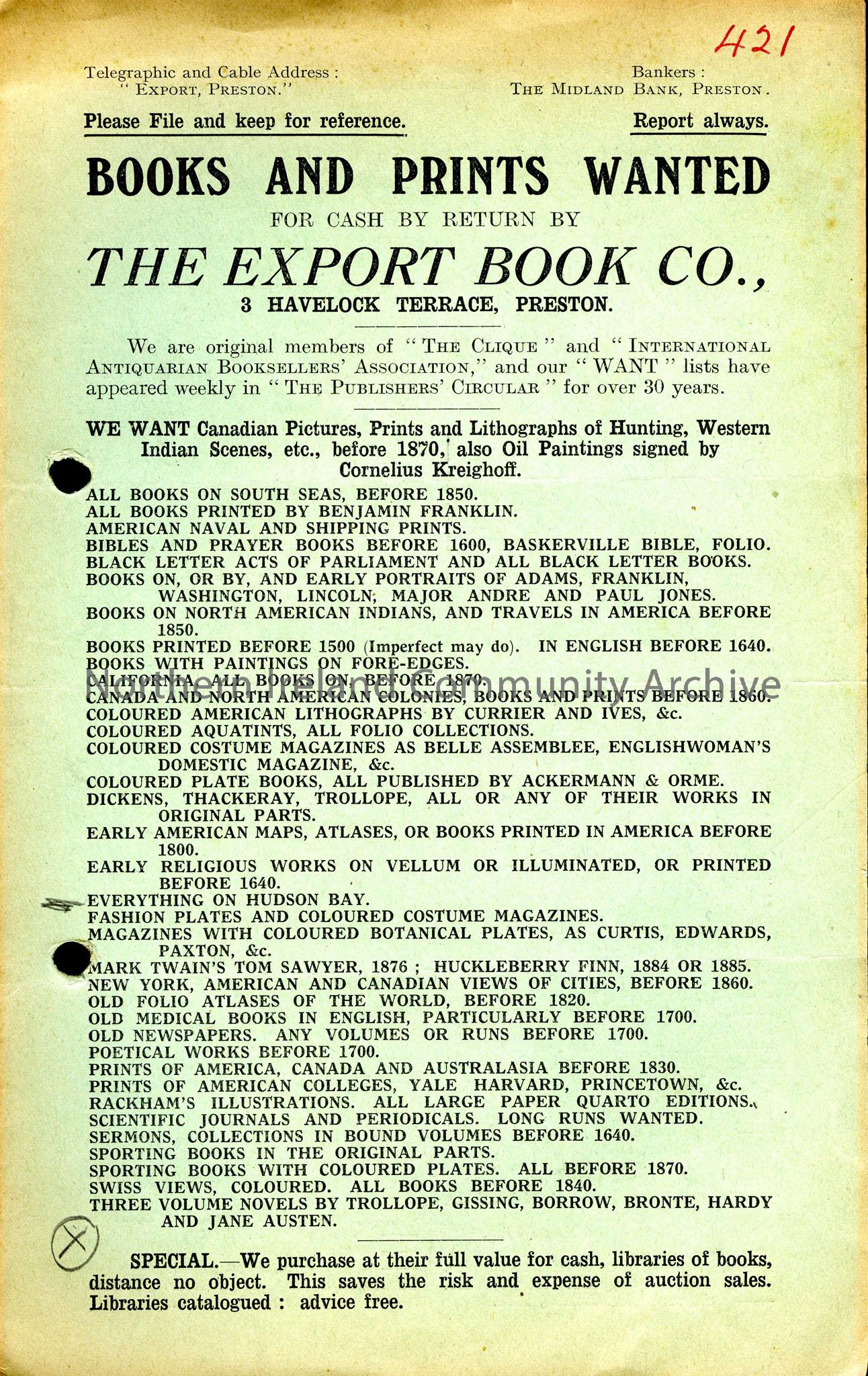 List of books and prints wanted by The Export Book Co., 3 Havelock Terrace, Preston