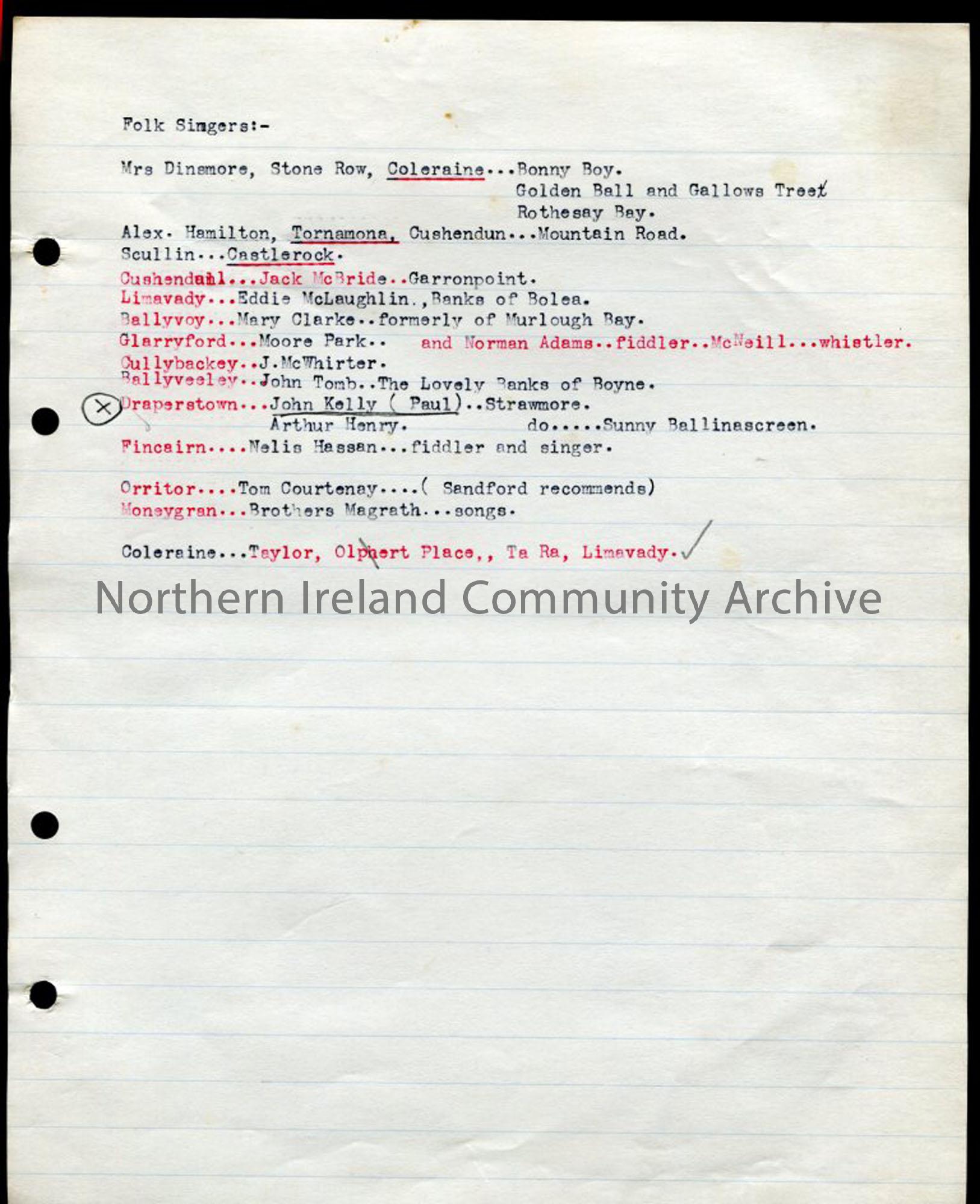 Typed list of folk singers by area, with some song titles entered against several names.