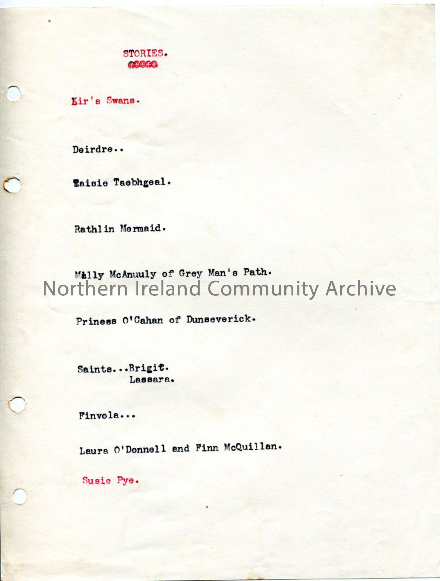 Typed list of titles only to stories from north coast of Antrim area.