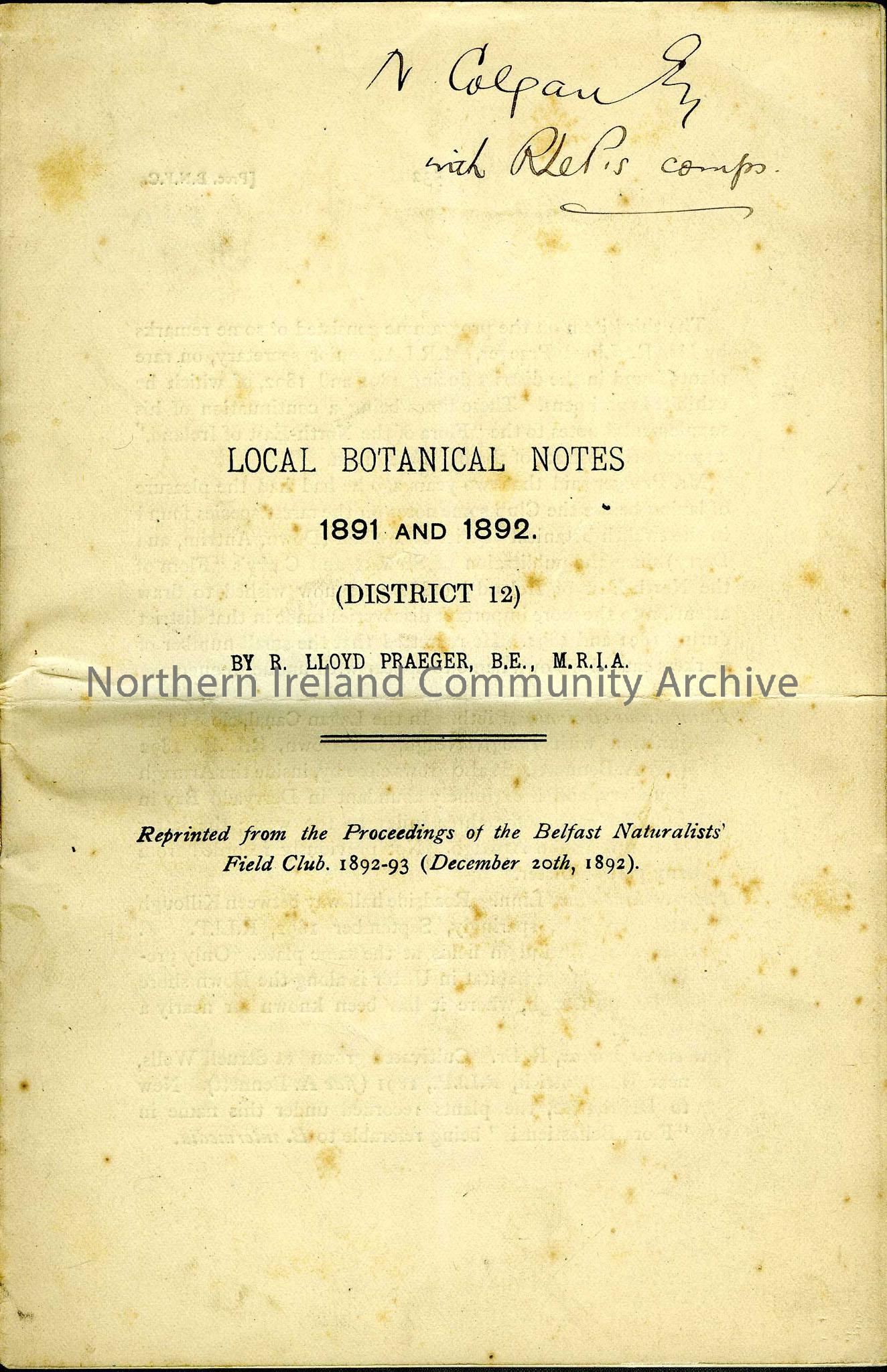 Local Botanical Notes 1891 and 1892 reprinted from proceedings of Belfast Naturalists' Field Club December 20th 1892