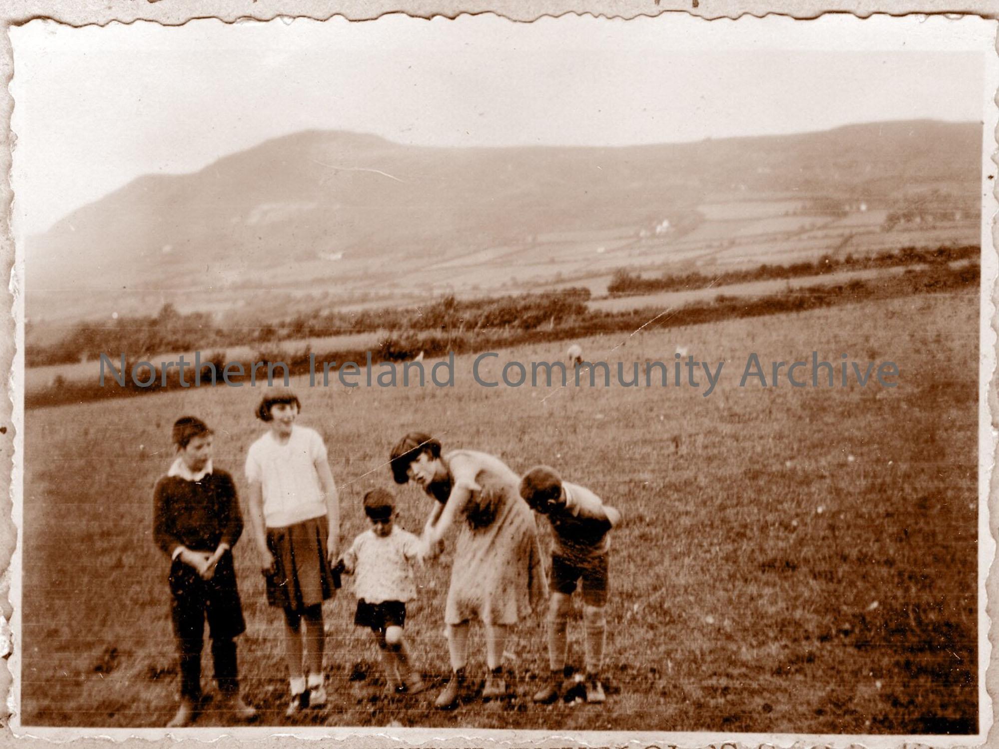 'Look at the camera.' Kilhoyle, Moneyquiggy and Donald's Hill in the background. L-R Gerald Farrell, Nance McKinney, Johnny McCloskey, Freda Farrell and Raymond McKinney.