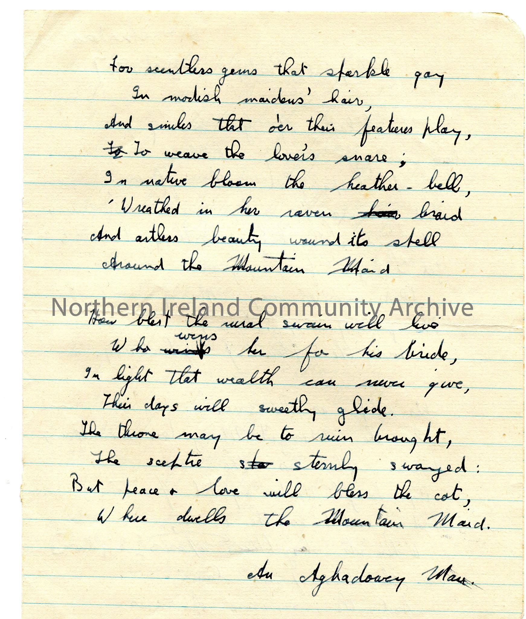 Loose pages of notebook, containing handwritten words to untitled poems, signed as ‘An Aghadowey Man’ and ‘Comberbach’, Andrew Orr’s pen names – ? Orr…