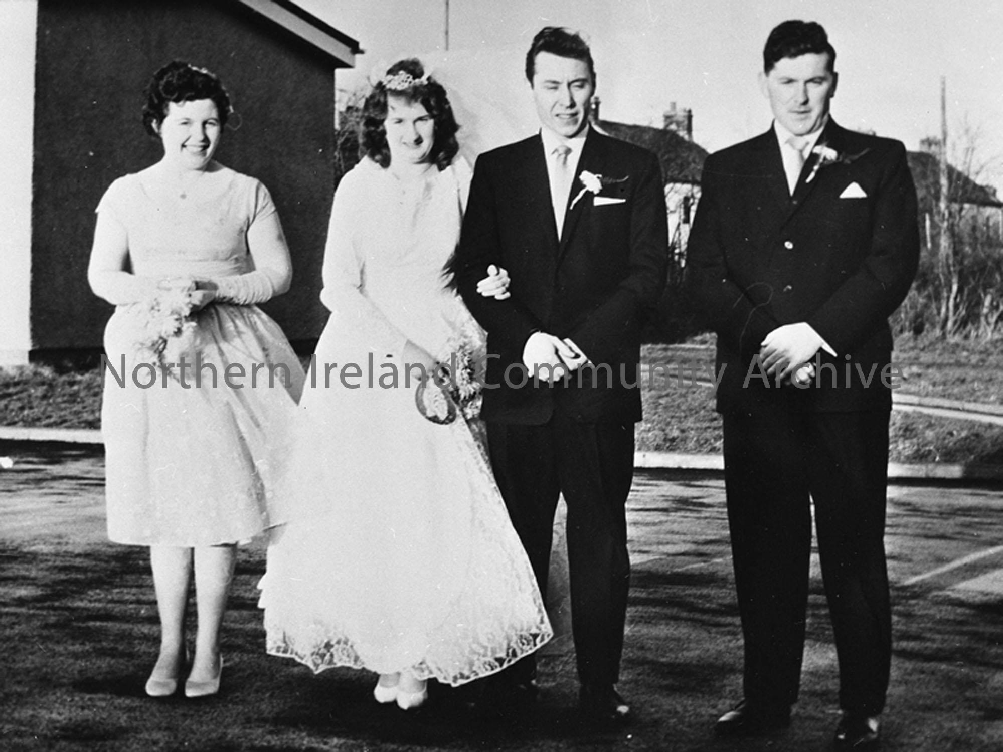 Mr W J Loughrey, Limavady and Miss Rita Cornwell, Lancashire, who were married in St. Mary’s R.C. Church, Limavady in January 1964. Mrs Margaret Lowry, sister of the bridegroom, was the bridesmaid and Mr John Loughrey was his brother’s best man. Courtesy of the Coleraine Chronicle