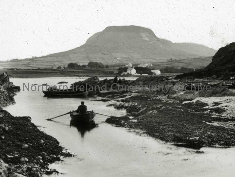 Notation on slide - Lurig (hill in background) and Cushendall Bay. Man in rowing boat in bay and scattered houses on shoreline. Also reffered to as Lurigedan -