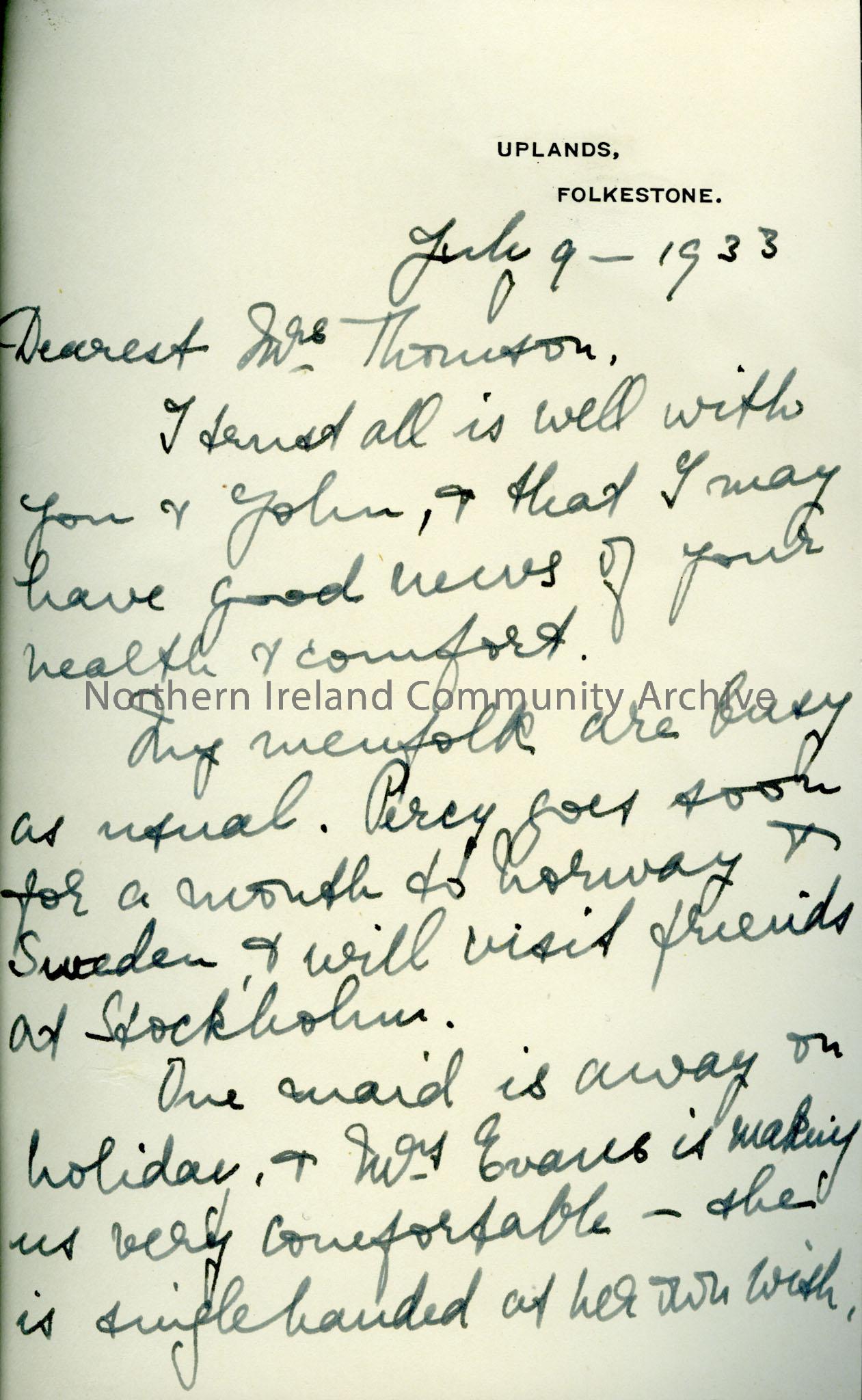 M H Speilman to Mrs Thomson, handwritten note