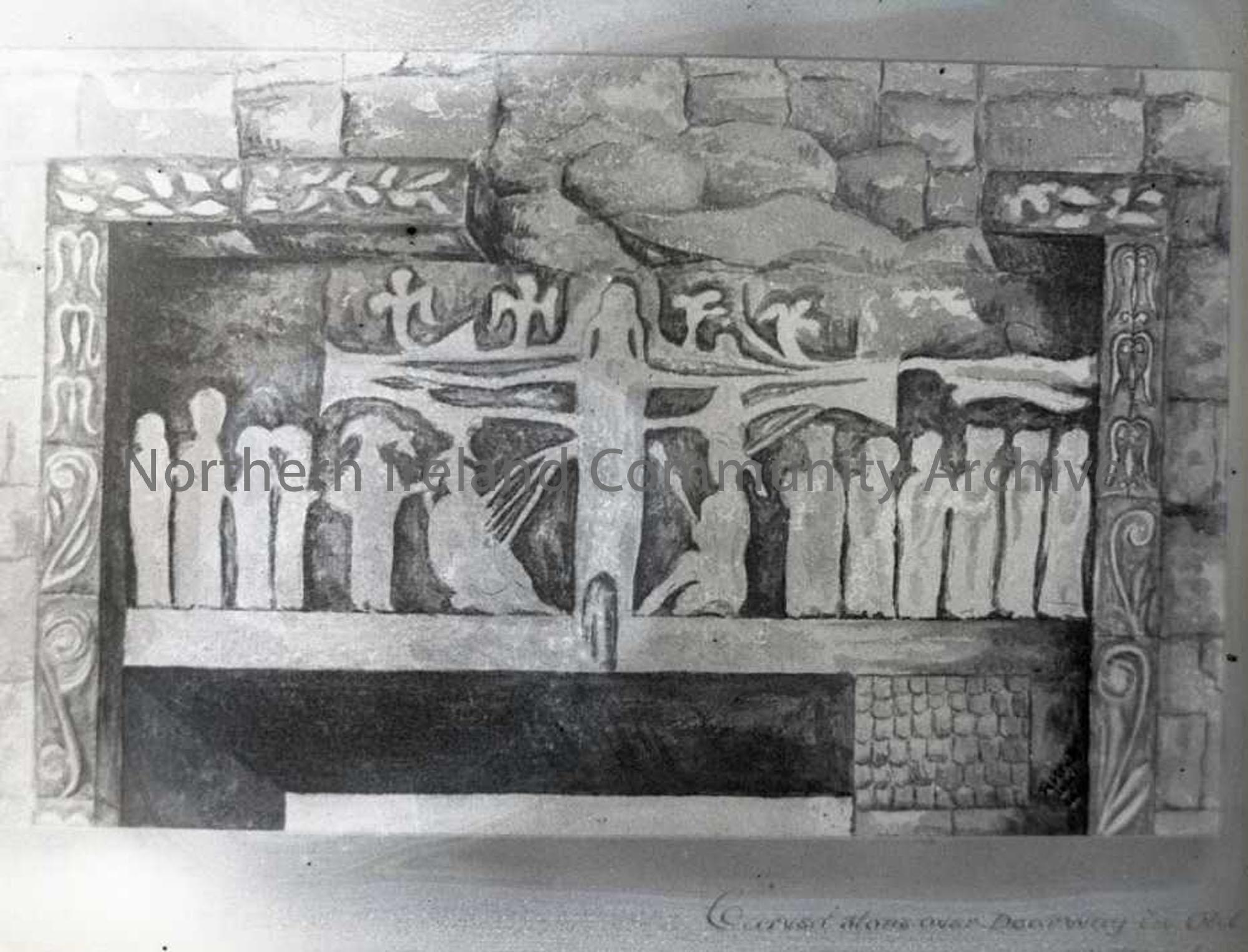 Black and white plate from book showing 'carved stone over doorway' - Maghera. No 168 in Nature Slides inventory