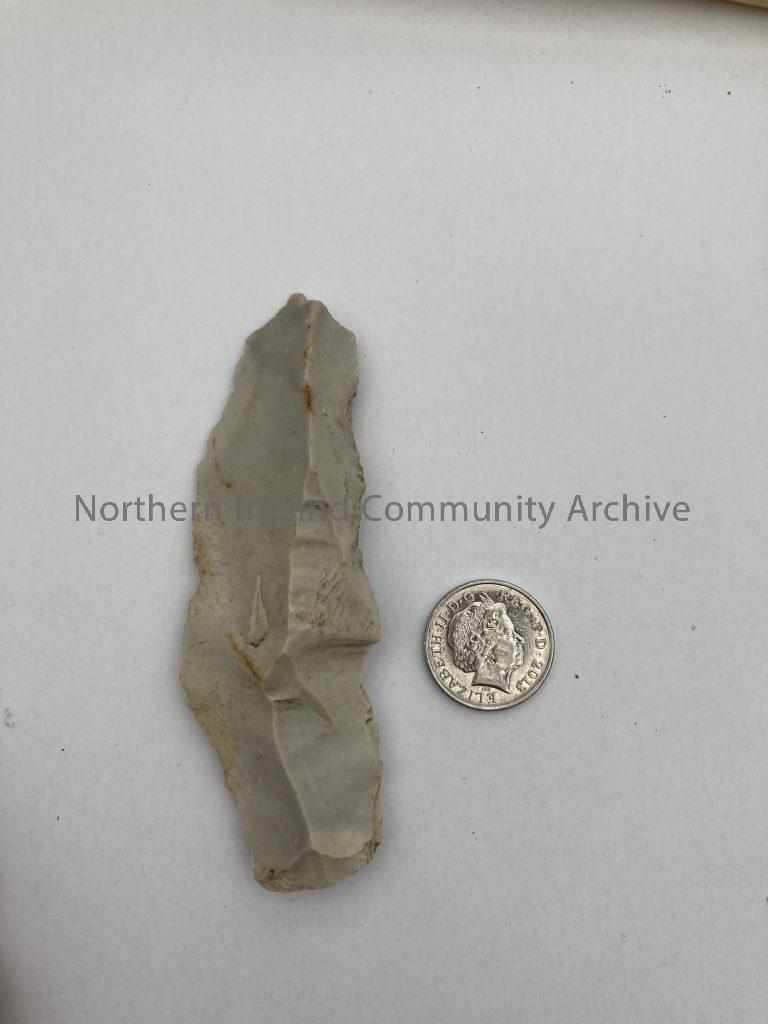 These items were uncovered by the McGill family in the agricultural fields surrounding their home, through years of field walking. While walking through freshly ploughed fields, a selection of stone age artefacts were found which include small flint tools from the era of Ireland’s first settlers. These Mesolithic ‘microliths’ are tiny stone tools made c.8,000 to 10,000 years ago. Later Neolithic (c.4,000-6,000 years old) stone tools including blades, scrapers, awls and other miscellaneous items are also found in the McGill collection. A fragment of a Porcellanite polished axe head was uncovered, this unique stone was traded by Neolithic peoples in North Antrim and was mined only in two locations at Tievebulliagh, Cushendall and on Rathlin island. Later artefacts include clay pipes, which show the ‘red hand of Ulster’ stamp found commonly on Ulster pipes in the 19th century.