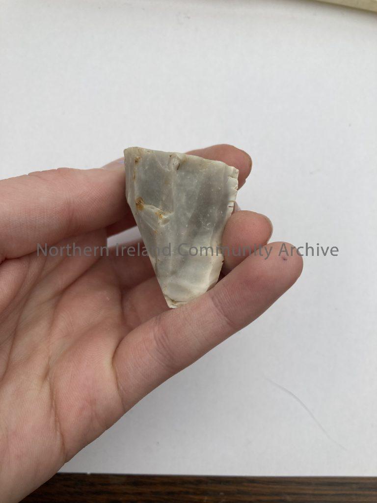 These items were uncovered by the McGill family in the agricultural fields surrounding their home, through years of field walking. While walking through freshly ploughed fields, a selection of stone age artefacts were found which include small flint tools from the era of Ireland’s first settlers. These Mesolithic ‘microliths’ are tiny stone tools made c.8,000 to 10,000 years ago. Later Neolithic (c.4,000-6,000 years old) stone tools including blades, scrapers, awls and other miscellaneous items are also found in the McGill collection. A fragment of a Porcellanite polished axe head was uncovered, this unique stone was traded by Neolithic peoples in North Antrim and was mined only in two locations at Tievebulliagh, Cushendall and on Rathlin island. Later artefacts include clay pipes, which show the ‘red hand of Ulster’ stamp found commonly on Ulster pipes in the 19th century.