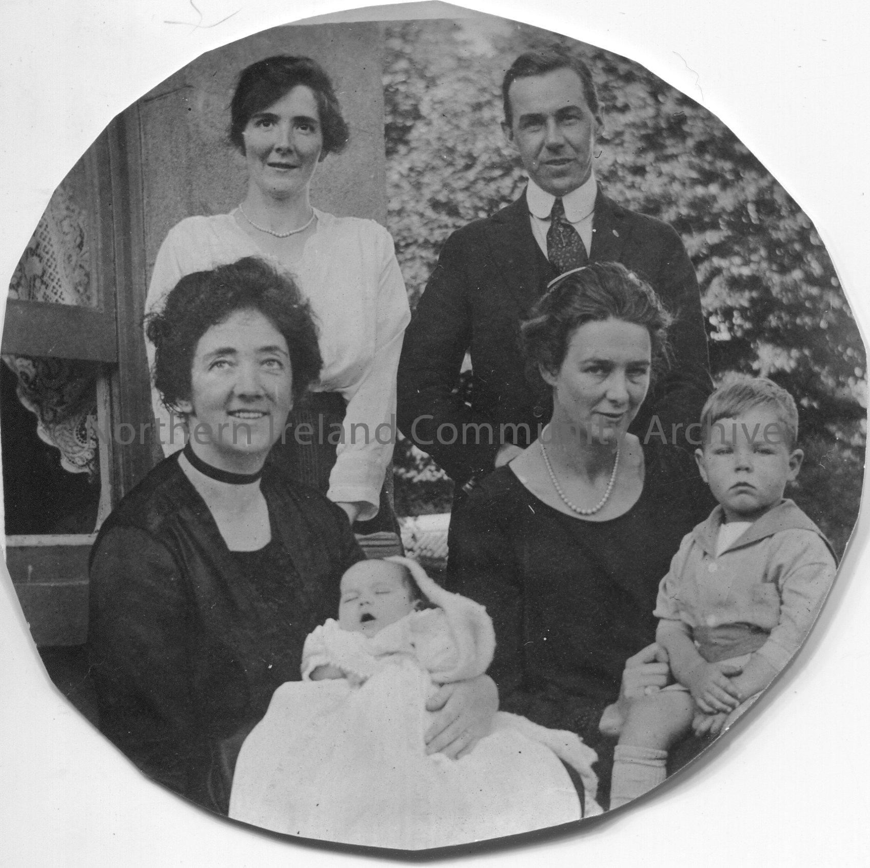 Maimie Henry holding her daughter, Olive. She is sitting with three other people and a small boy.