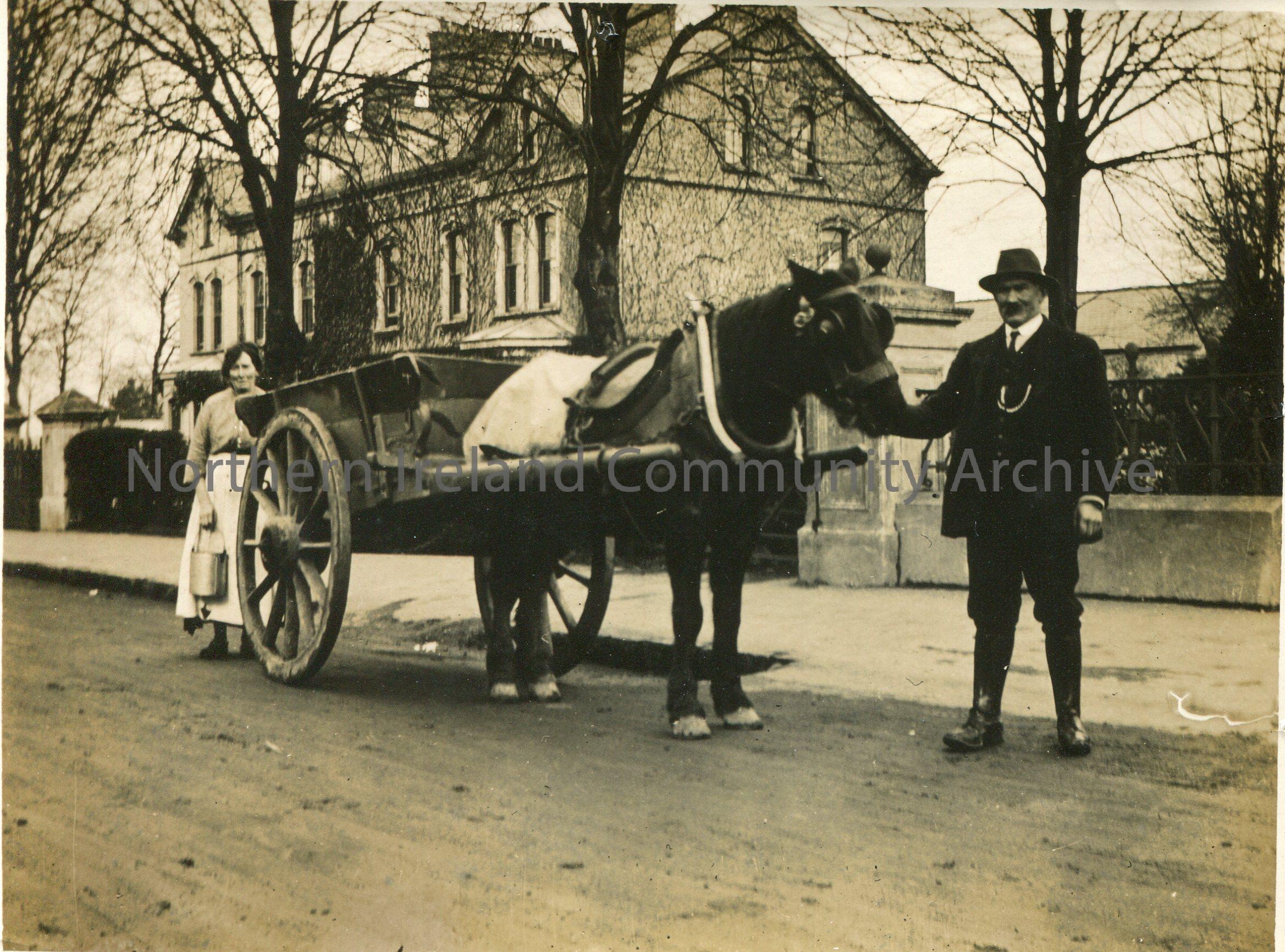 Man and woman standing at a horse and cart on the Lodge Road, Coleraine. Two houses are in the background - Nos. 38 and 40. They became part of Coleraine High School.