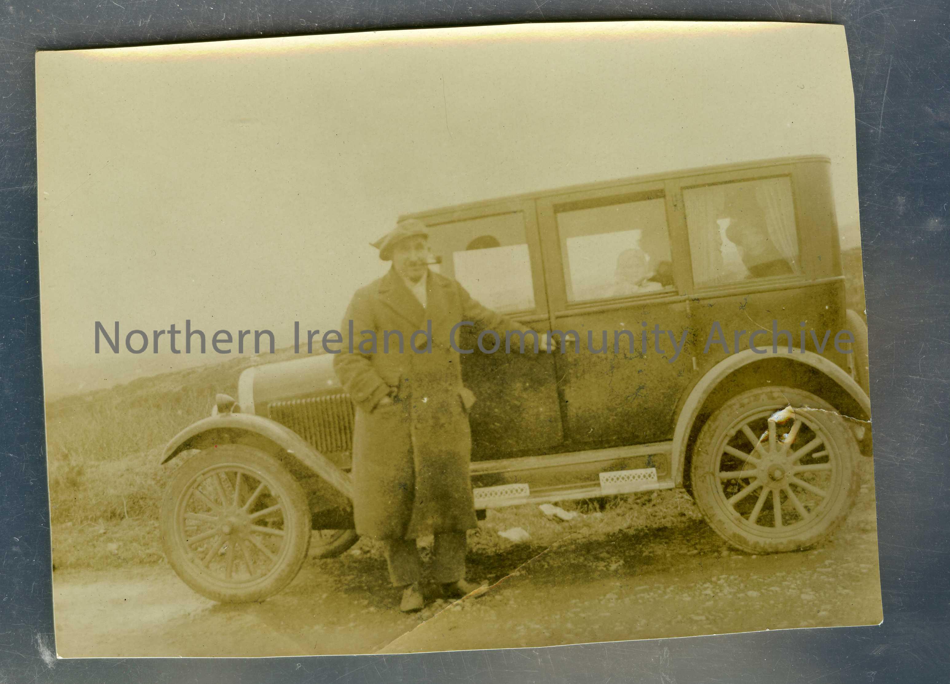 Man smoking a pipe and standing outside a motorcar with his hand on the handle.