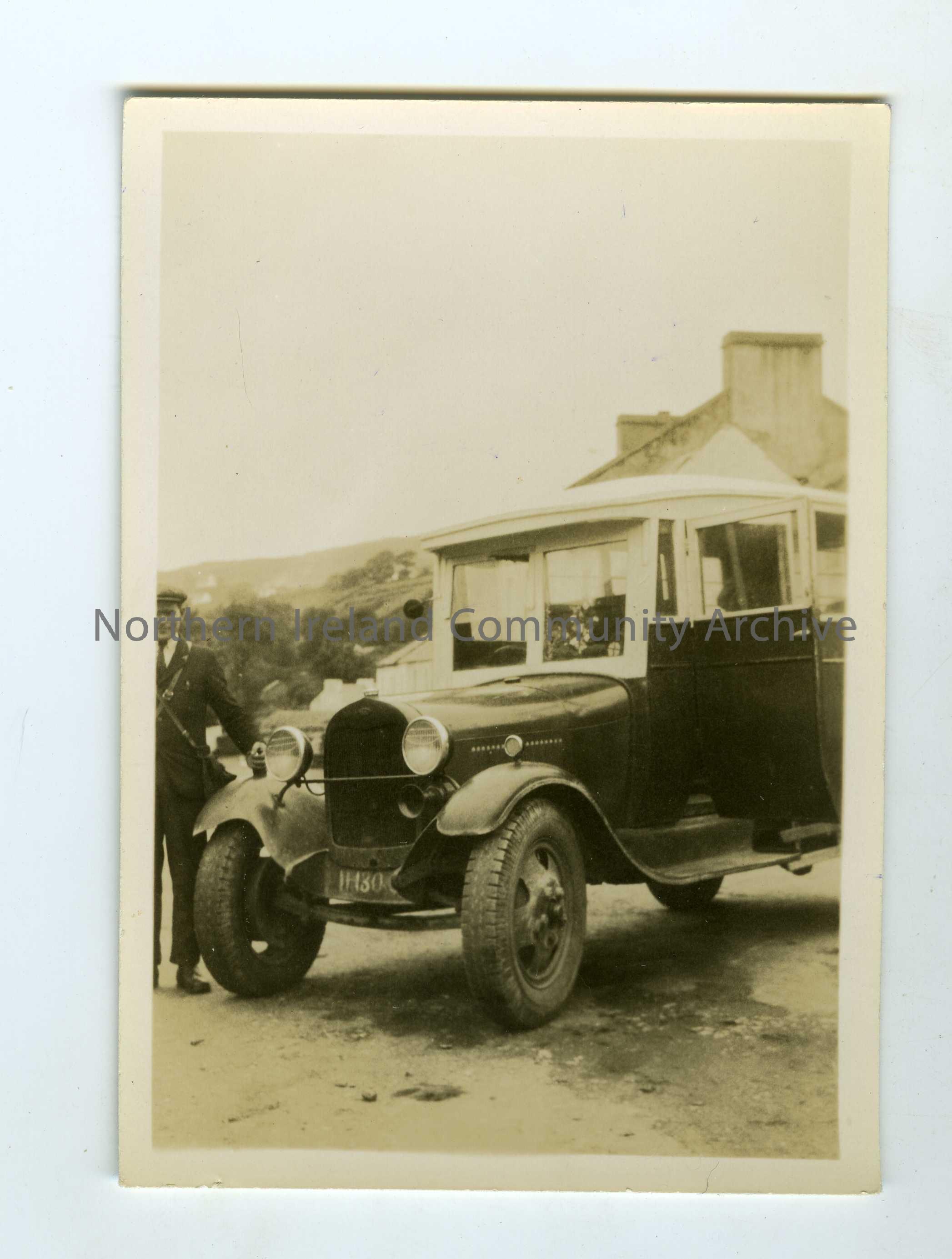Man standing beside a motorcar. ‘Bill’ or ‘Rill’ handwritten on reverse.