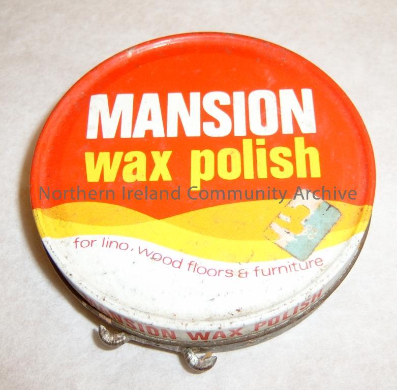 Mansion wax polish tin, for lino, wood, floors & furniture. Printed on back of the tin, Made in Britain, Reckitt & Colman Hull, Export Distributors, Reckitt & Colman (Overseas) Ltd (3079)