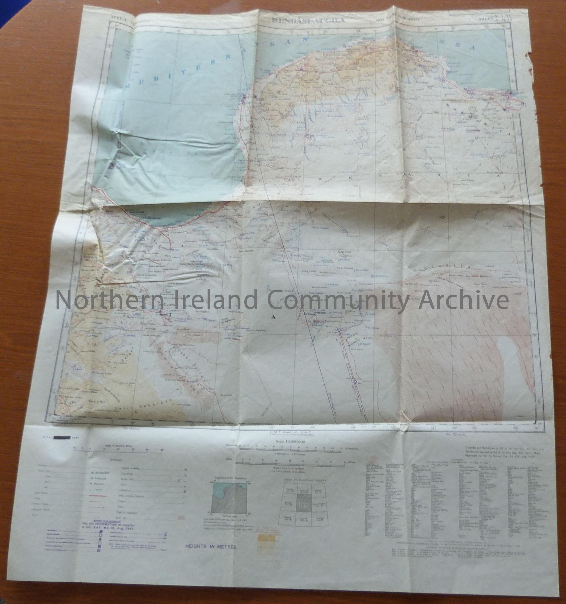 Map titled “Bengasi – Augila. Cream map of part of Libya with blue and orange detail. Key at the bottom