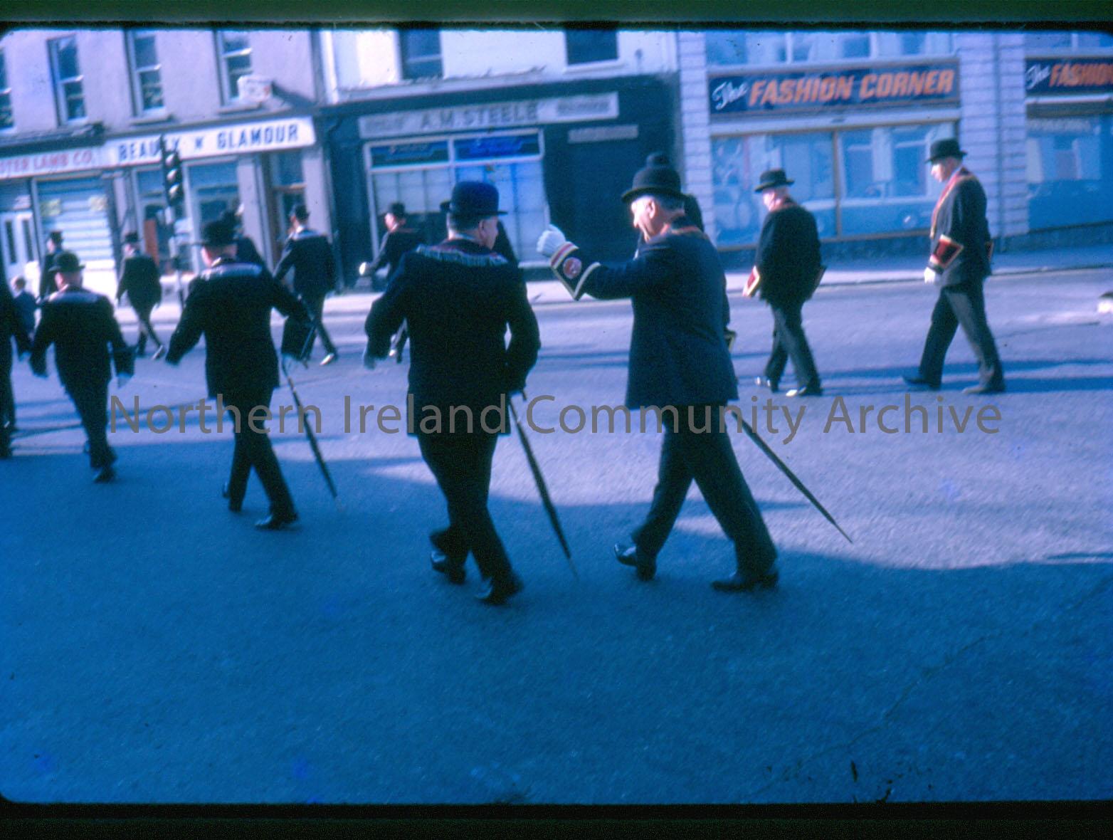 slide depicting men marching at at a parade in Coleraine during June 1970. Slide numbered 29 and dated July 1970.
